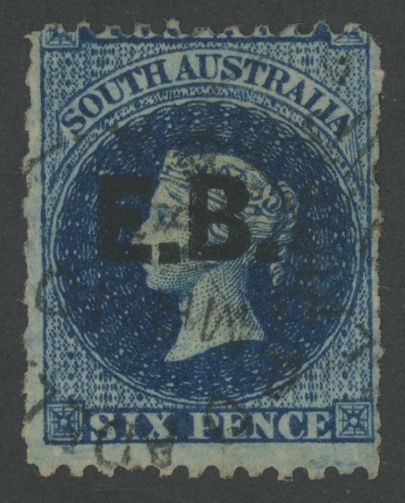 309 F imageBLACK OVERPRINT: 'E.B.' on QV Perkins Bacon Large Star Wmk Perf 11½-12½ 6d Prussian blue SG DO220 with 'B.' of 'E.B.' Dropped, cut from the sheet clear of the design at right, a few trimmed perfs at the base, GPO cds of MY12/7-., Cat £300+. Rated RRR+: the only recorded example of the variety. Ex Don Pearce: sold for $503 (Sale 247 Lot 292). (Image1) (Image2)