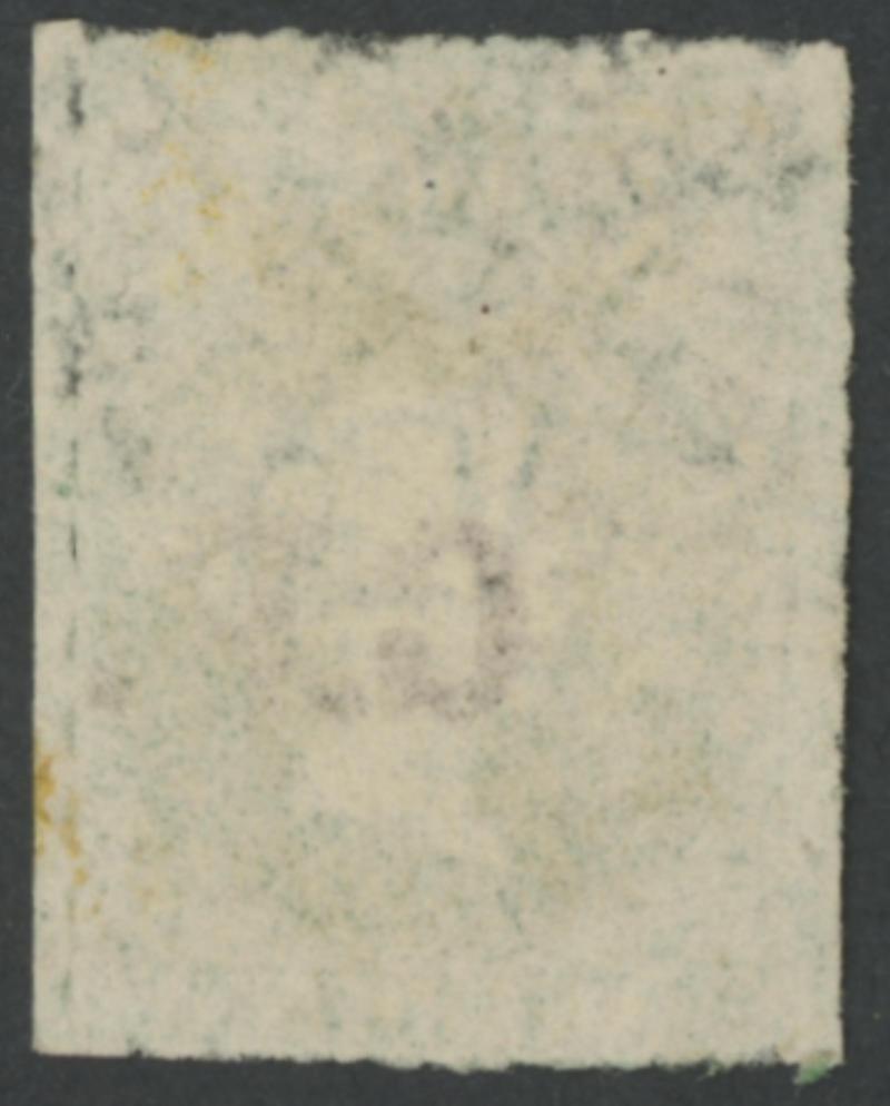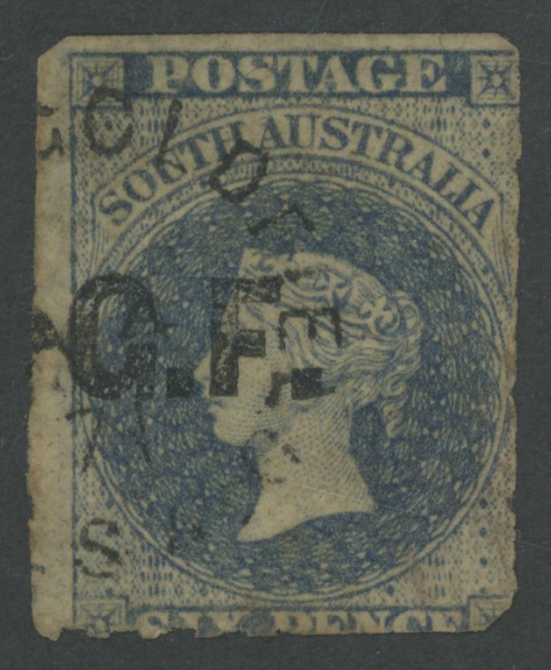 313 F imageBLACK OVERPRINT: 'G.F.' on QV Perkins Bacon Large Star Wmk Rouletted 6d dull blue DO224, rouletting on all sides, small faults & aged, '[BAROSSA] GOLDFIELD/JA--/71/S-A' cds, Cat £1400. Rated RRRR: unrecorded unused. Ex Don Perarce: sold for $1675 (Sale 247 Lot 322). Absent from 'Besancon'. [Date range -.1.1871 to 1.4.1871 only] (Image1) (Image2)