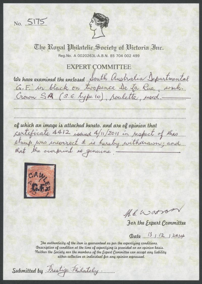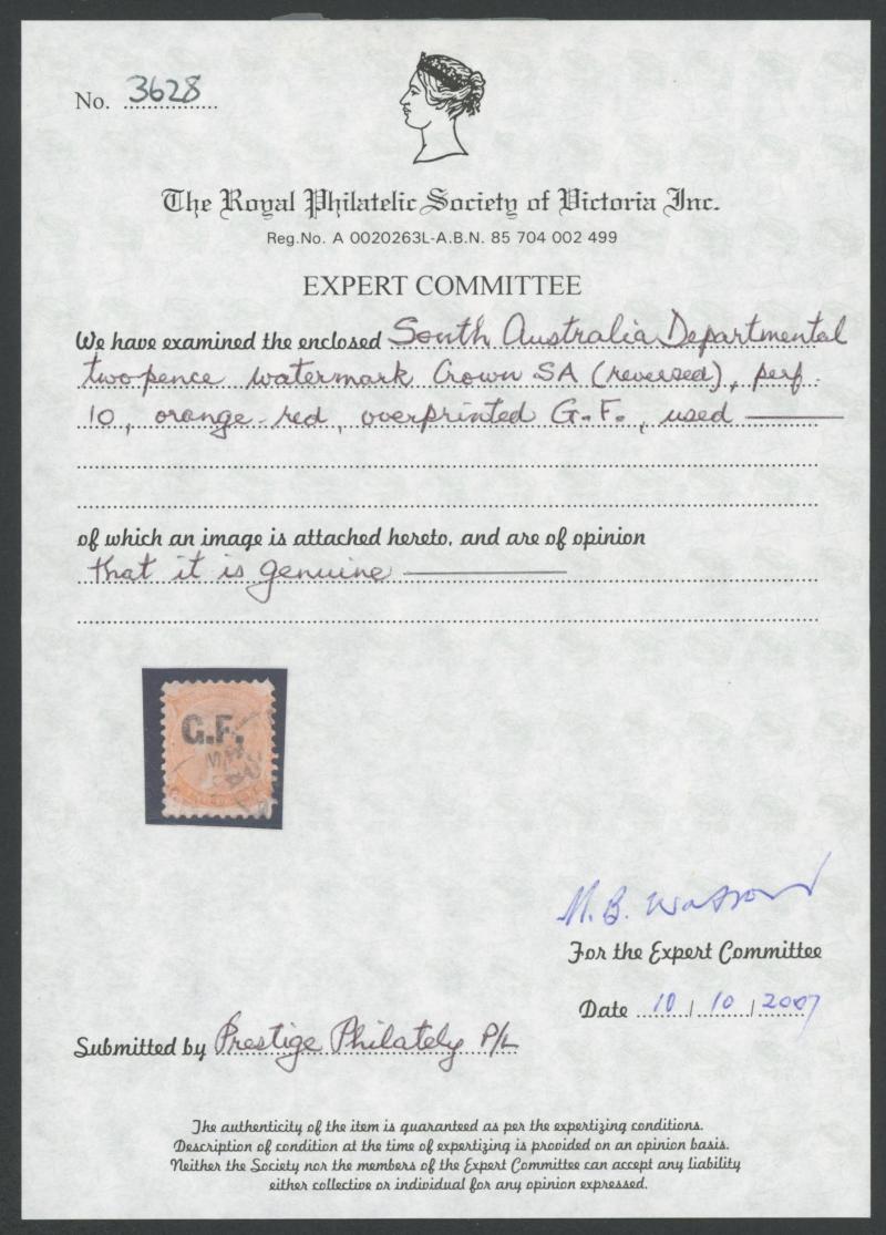 310 G imageBLACK OVERPRINT: 'G.F.' on QV De La Rue Crown/SA Wmk Perf 10xRouletted 2d dull orange SG DO225, rouletting at right otherwise cut from the sheet to largely preserve the design, bold 'GAWLER/AU30/70/S.A' cds, Cat £2250. Rated RRRR: unrecorded unused. Ex 'Sir Humphrey' (Brian Farmer) - sold for $1207 (Sale 118 Lot 356) - and Rodney Attwood: sold for $1005 (Sale 198 Lot 2090). RPSV Certificate (2014). Don Pearce's fine example - full separations, small scissor-cut clear of the design - sold for $3355 (Sale 247 Lot 318). Absent from 'Besancon'. [Date range 20.8.1870 to 7.10.1870 only] (Image1) (Image2) (Image3)