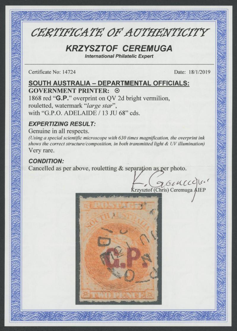 315 F imageRED OVERPRINT: 'G.P.' on QV Perkins Bacon Large Star Wmk Rouletted 2d bright vermilion SG DO228, rouletting remarkably clear of the design on all sides, light GPO cds of 'JU13/68', Cat £250. Rated RRRR: unrecorded unused. Chris Ceremuga Certificate (2019) states very rare". Far more attractive than the 'Besancon' example that sold for SFr485. Superior quality to Don Pearce's example that sold for $455 (Sale 247 Lot 341). [Date range 13.5.1868 to 1.8.1868 only] (Image1) (Image2) (Image3)