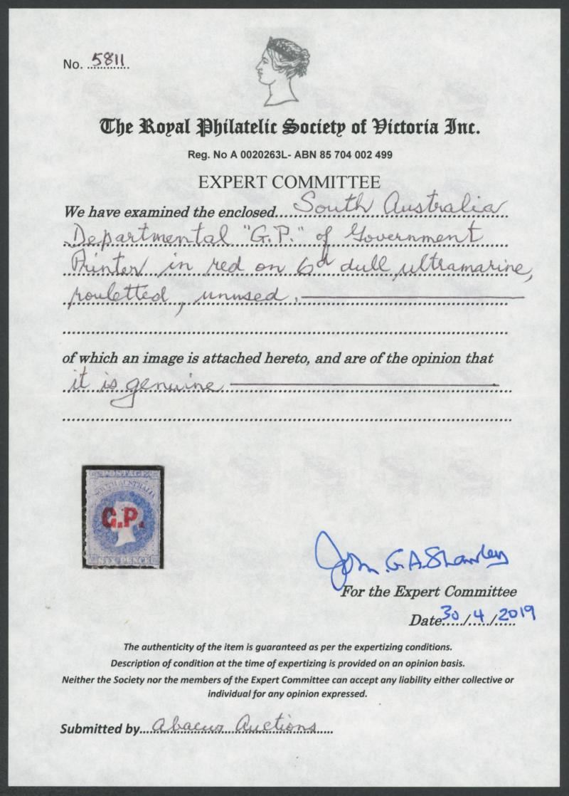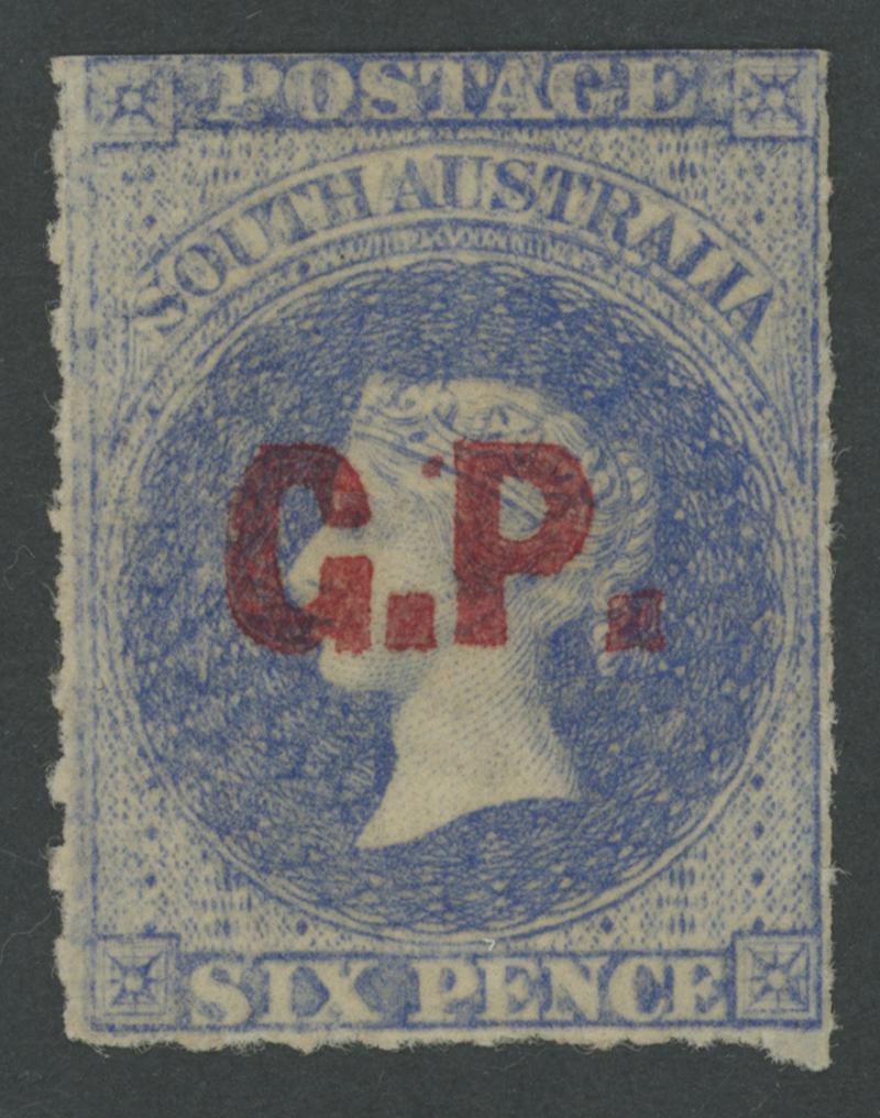 316 og imageRED OVERPRINT: 'G.P.' on QV Perkins Bacon Large Star Wmk Rouletted 6d ultramarine SG DO229, rouletting except at top where cut from the sheet just clear of the design, large-part gum, Cat £950. Rated RRRR. Superb. Ex Hugh Wynn and 'Tamiami': sold for $1795. RPSV Certificate (2019). The similar Vestey and 'Besancon' examples sold for £1020 and SFr1090 respectively. Absent from Don Pearce's collection. (Image1) (Image2) (Image3)