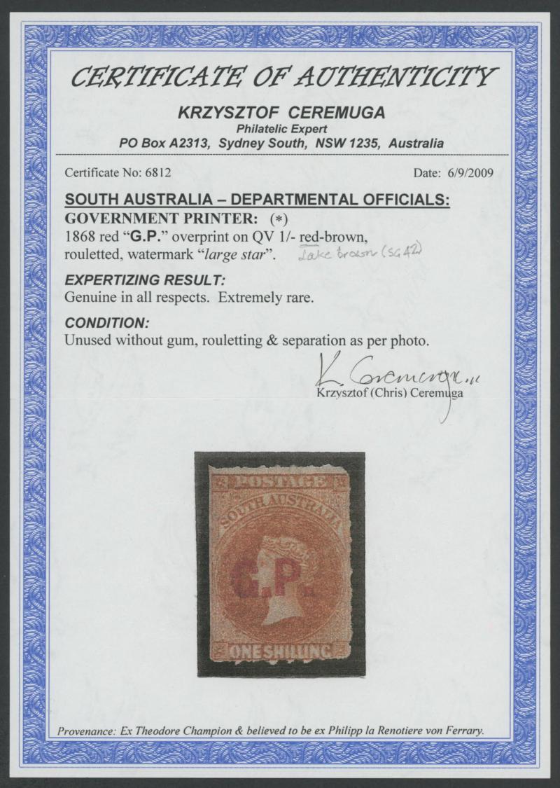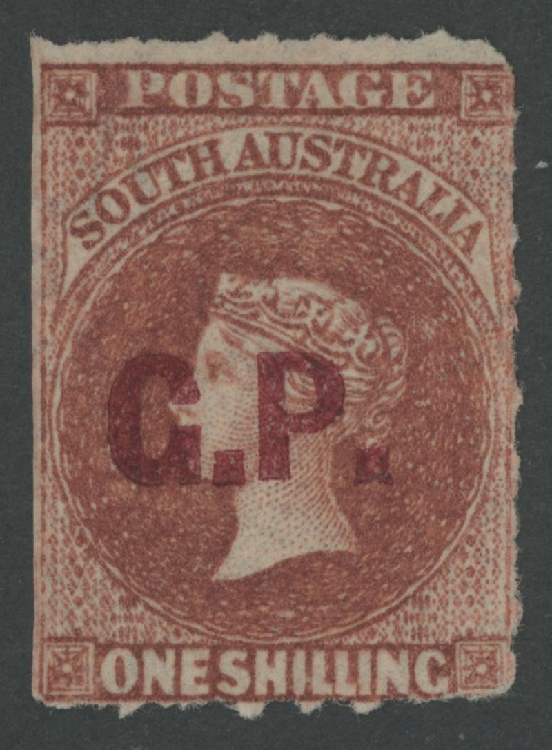 317 # imageRED OVERPRINT: 'G.P.' on QV Perkins Bacon Large Star Wmk Rouletted 1/- bright red-brown SG DO230, rouletting except at left where cut from the sheet clear of the design, very minor separation fault at upper-right, unused, Cat £750. Rated RRR. Ex Baron von Ferrary, Theodore Champion and Philip Croker. Chris Ceremuga Certificate (2009) states "extremely rare". The similar Vestey and 'Besancon' examples sold for £575 and SFr1330 respectively. (Image1) (Image2) (Image3)
