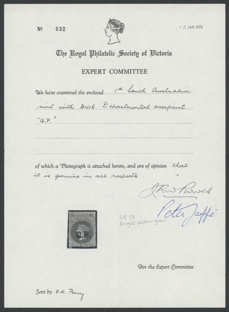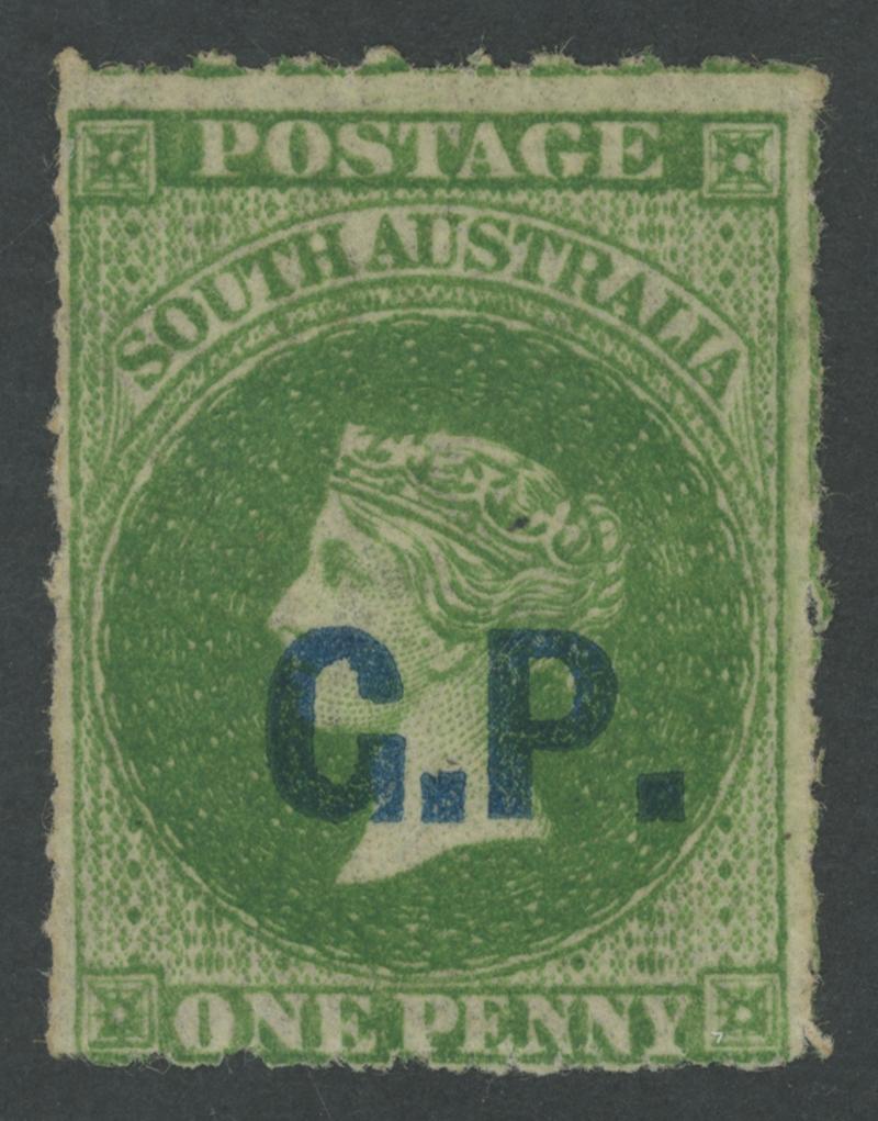 319 og imageBLUE OVERPRINT: 'G.P.' on QV Perkins Bacon Large Star Wmk Rouletted 1d deep yellow-green SG DO231, rouletting on all sides, large-part gum, Cat £850. Rated RRR. Superb. Ex Colonel Napier (I). RPSV Certificate (1979). The similar 'Besancon' example sold for SFr1090. Don Pearce's example with a couple of separation faults sold for $1080 (Sale 247 Lot 345). (Image1) (Image2) (Image3)
