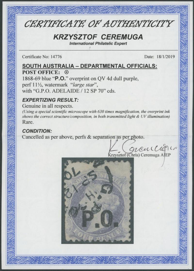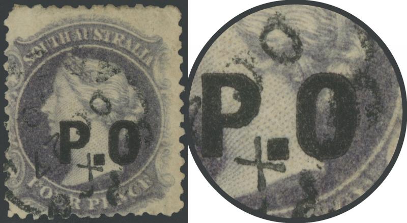 567 F imageBLACK OVERPRINT: 'P.O.' on QV Perkins Bacon Large Star Wmk Perf 11½-12½ 4d pale violet Printed on Both Sides SG DO417b with the original printing on the 'reverse' upright relative to the 'face', minor thin at lower-left & a trifle aged, GPO cds of 'SP12/70', Cat £750. Rated RRRR; unrecorded unused. Ex Don Pearce: sold for $895 (Sale 247 Lot 582). Superior appearance to Gary Diffen's example, that was unsold on an estimate of £1500. Absent from 'Besancon'. This variety was first reported in 'The Postage Stamps of South Australia' by NR James published in 1947. [Date range 1.9.1870 to 14.9.1870 only] (Image1)