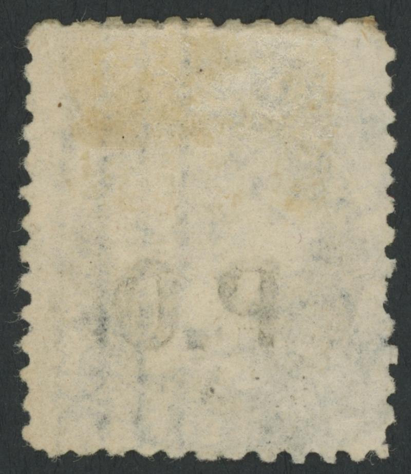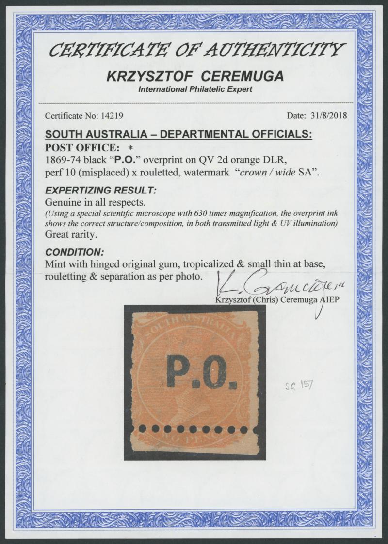 565 og imageBLACK OVERPRINT: 'P.O.' on QV De La Rue Crown/SA Wmk Perf 10xRouletted 2d deep orange SG DO422, misplaced perfs so cut from the sheet at top slightly into the design and at base clear of the design, the lower piece separated & rejoined with a hinge, shallow thin at the base, stained by the large-part brown gum, Cat £700. Rated RRRRR but the only example known to us. Ex Colonel Napier (II) and 'Besancon': sold for SFr725. Chris Ceremuga Certificate (2018) states "Great rarity...original gum". Absent from Don Pearce's collection. [In the Napier catalogue, this stamp was inappropriately described as "pawky", an odd little word that means having a mocking or cynical sense of humour. Perhaps they meant "mawky", but that's harsh: the stamp is hardly nauseating] (Image1) (Image2) (Image3)
