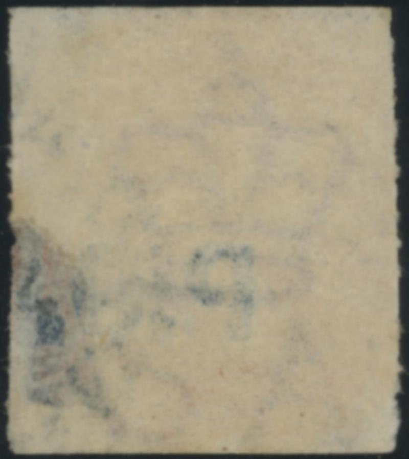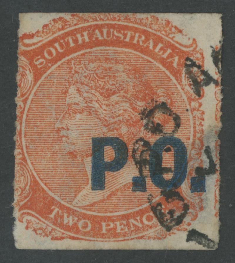 561 V imageBLUE OVERPRINT: 'P.O.' on QV De La Rue Crown/SA Wmk Rouletted 2d dull orange SG DO411 with the Watermark Reversed, rouletting at the sides and cut from the base at top & base largely clear of the design, shallow thin at lower-right, small-part GPO cds, Cat £225+. Rated RRR+. Superior to Don Pearce's example - separation faults at right - that sold for $383 (Sale 247 Lot 573). [Date range 3.5.1869 to 22.8.1869 only] (Image1) (Image2)