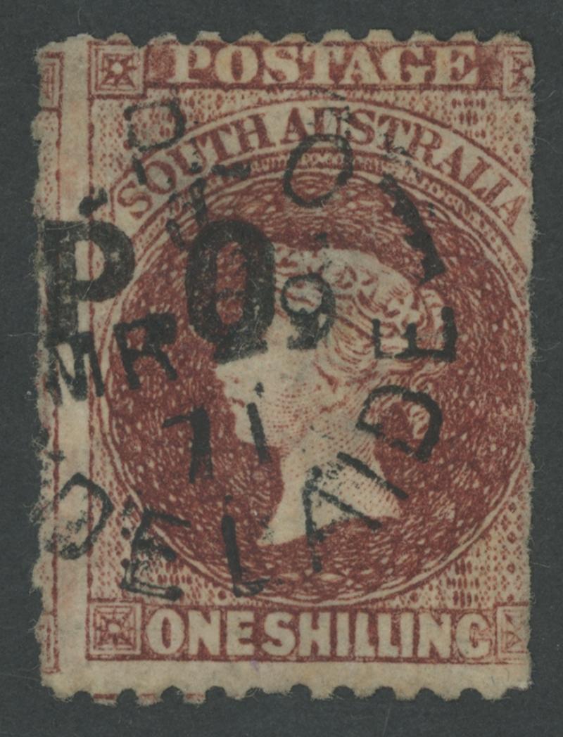 573 F imageBLACK OVERPRINT: 'P.O.' on QV Perkins Bacon Large Star Wmk Perf Perf 11½-12½xRouletted 1/- red-brown SG DO415 late printing from the worn plate with Overprint Misplaced to Left, shallow thin, fine GPO cds of 'MR29/71', Cat £225. Rated RR; unrecorded unused. Ex 'Sir Humphrey' (Brian Farmer): sold for $134 (Sale 118 Lot 477). Don Pearce's superb example sold for $455 (Sale 247 Lot 587). [Date range 8.6.1870 to 20.11.1871] (Image1) (Image2)