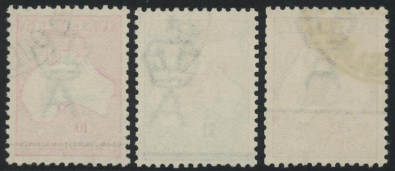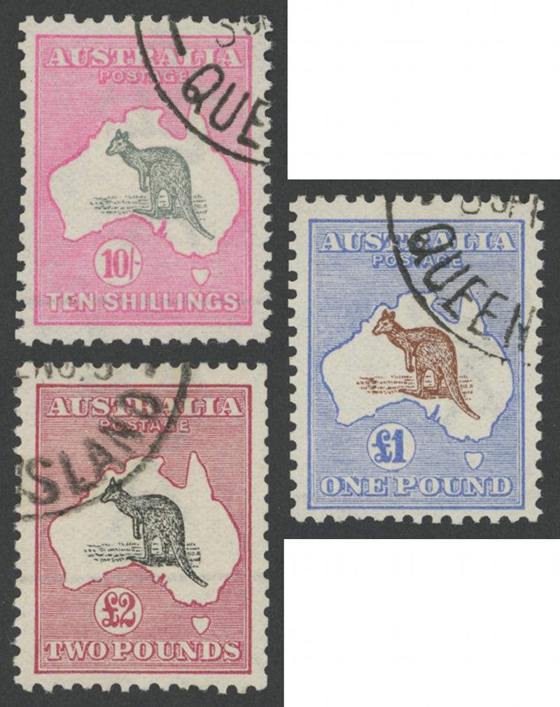1153 cTO image10/- grey & pink, £1 brown & blue and £2 black & rose-carmine SG 14-16 all CTO with partial 'BRISBANE/QUEENSLAND' cds ACSC 47wd 51wd & 55wc, all from the base of the panes with horizontal marginal watermark lines at the base, the 10/- & £2 are particularly well-centred, the £2 with a few slightly trimmed perfs at upper-right otherwise a superb trio, no gum, Cat $15,250. A remarkable opportunity to acquire the top three denominations from this rare series. Provenance: a collector in Europe. Peter O'Rourke's very fine 10/- with full gum sold in 2020 for $2025. A £1 with a few trimmed perfs sold at our auction of 27.4.2022 for $3235 (Sale 247 Lot 2116) and the 'Goldmine' example - a little soiled - sold in 2019 for $3340. We have no recent result for the Two Pounds. (3) (Image1) (Image2)