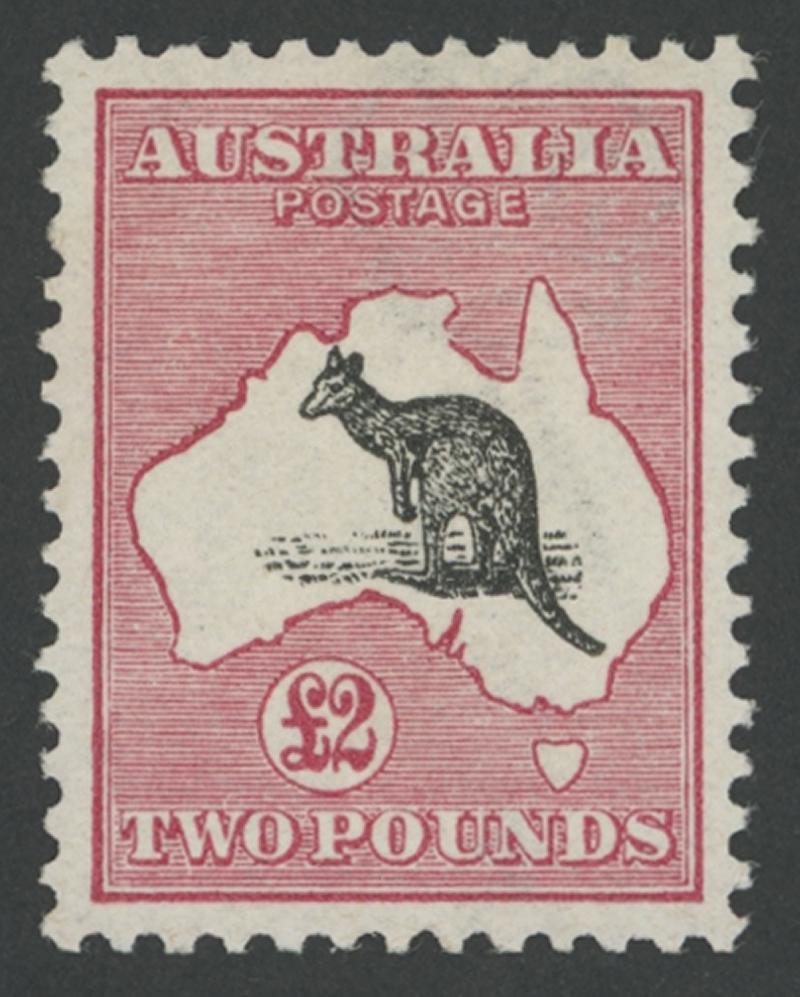 1157 og image£2 black & rose-carmine ACSC 55 (SG 16) with Break in West Coast of the Gulf of Carpentaria #55(D)v, exceptional centring, lightly mounted, Cat $12,500 (£7500) - or $17,500 with the variety. A beautiful and superb example of this iconic stamp, that is missing from most collections. Ex 'Dubois' (III): sold for SFr4270. One of the finest examples we have seen: at least the equal of the superb stamp sold at our auction of 16.5.2023 for $10,370 (Sale 251 Lot 86). (Image1) (Image2)