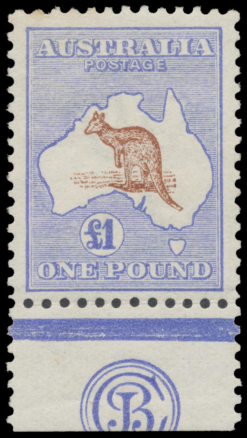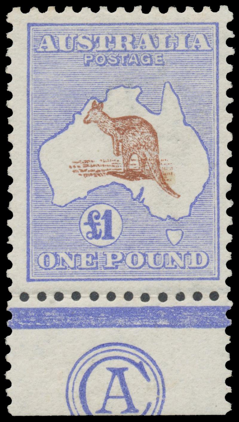 1155 og image£1 red-brown & blue SG 15 (Scott 14) 'CA' Monogram single ACSC 51z, well-centred, the monogram slightly trimmed at the base, small hinge remainder, Cat $65,000. Ex Arthur Gray - sold in 2007 for $US63,250 ($A87,000+ at the time) - and Julian Sterling: sold at our auction of 19.6.2015 for $66,690 (Sale 204 Lot 108). The ACSC states that "monograms are very rare" with only five mint singles - one in the Australia Post Archives - and no strip of 3 recorded, and that "every example seen of both monograms is incomplete by being trimmed at the base". A great rarity of Commonwealth philately. (Image1) (Image2)