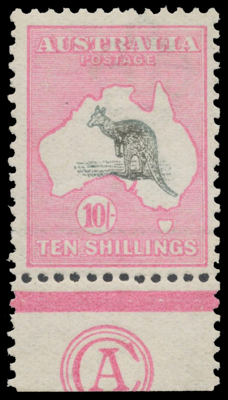 1154 nh image10/- grey & pink SG 14 (Scott 13) 'CA' Monogram single ACSC 47z, the monogram slightly trimmed at the base, unmounted, Cat $50,000+ for mounted. The ACSC states that "monograms are extremely rare" with only six mint examples - one Punctured Large 'OS' - recorded, and that "every example seen of both monograms is incomplete by being trimmed at base". Ex Julian Sterling: sold at our auction of 19.6.2015 for $51,480 (Sale 204 Lot 100). (Image1) (Image2)