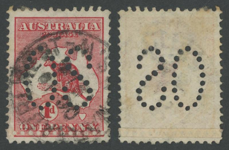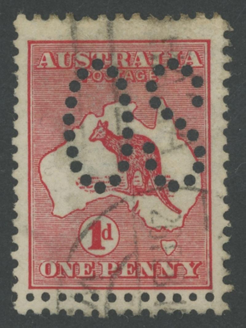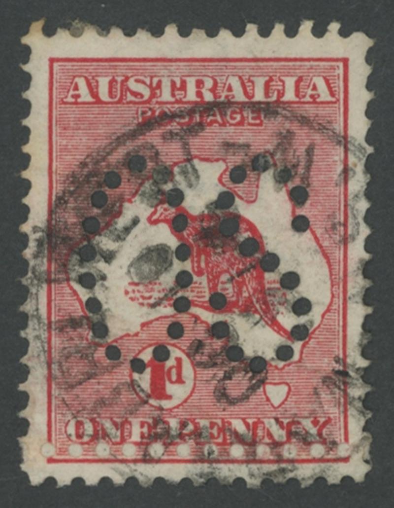 1169 G image1d red Die II ACSC 3ba (SG O2d) with Double Perforations at Sides & Base ACSC 3b, the upper horzontal line of perfs at base reinforced by an official repair, slightly untidy 'NARRABRI WEST/OC 10/1914/NSW' cds cancel, minor wrinkling as often seen from being punctured Large 'OS' and a couple of light aging marks, Cat $560+. Ex David Adams. PCNZA Certificate (2025). (Image1) (Image2) (Image3)