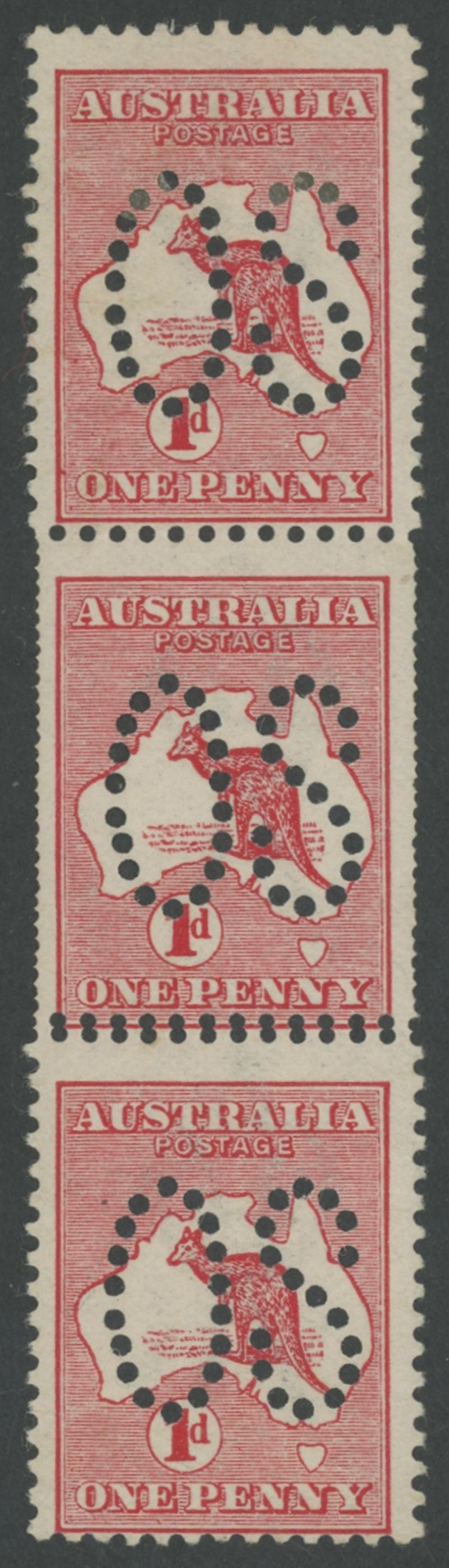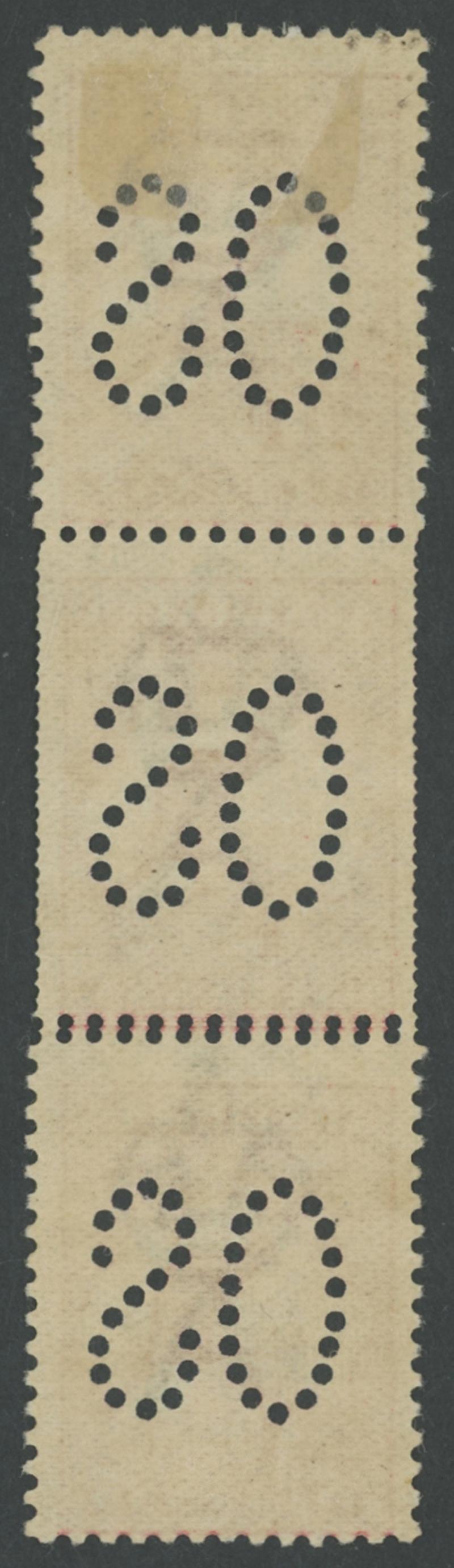 1158 og/nh image1d red Die I ACSC 2ba (SG O2) vertical strip of 3, the central unit with Double Perforations at Sides & Base and the unit below with Double Perforations at Top ACSC 2b, the upper unit with a hinge remainder, the lower variety units unmounted, Cat $2040+ for two Double Perforations unmounted singles & one normal mounted single. Ex David Adams. PCNZA Certificate (2025). (Image1) (Image2)