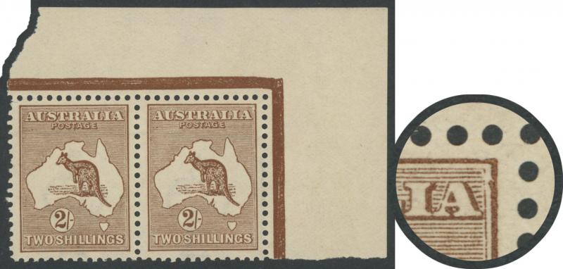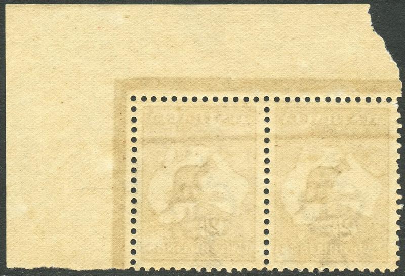 1152 nh image2/- brown Die II SG 12 marginal pair from the upper-right corner of the sheet, the right-hand unit with Colour Spot on Right Frame at Top [Pos 1R5-6] ACSC 35(1)k, small perf separation & fault at upper-left of the left-hand unit, the right-hand unit very fine, unmounted, Cat $5500+ (£550+ for normal mounted singles). Sold at our auction of 31.8.2019 for $3186 (Sale 237 Lot 1096). (Image1) (Image2) (Image3)