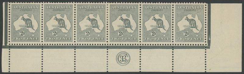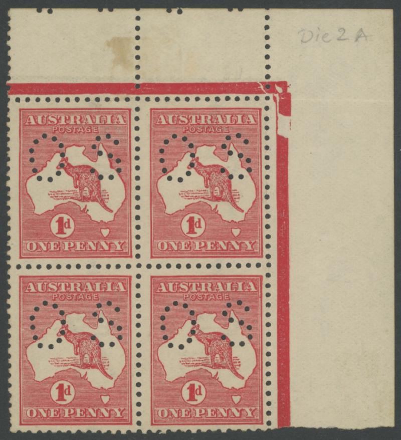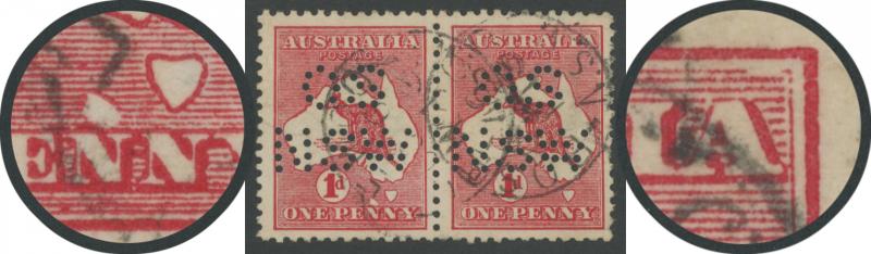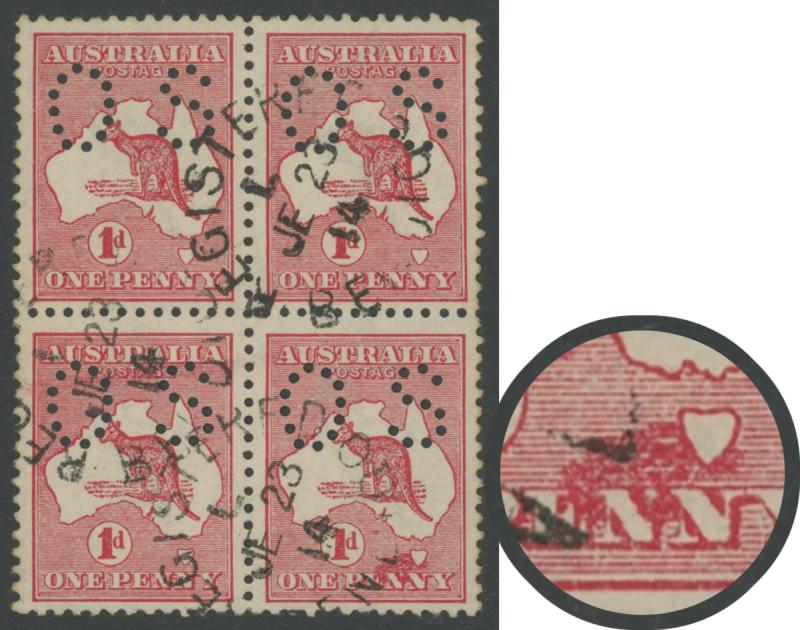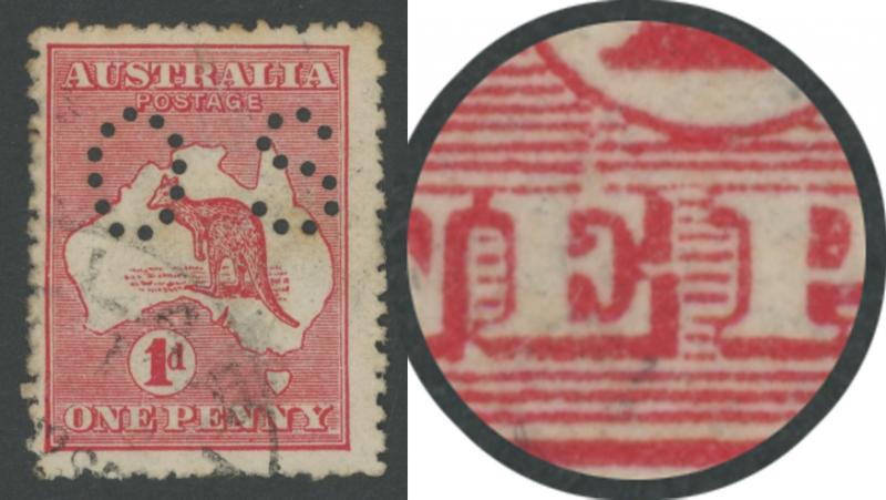 One of the most outstanding plate varieties in the entire Kangaroo & Map Series. Rare: the ACSC states that the flaw was identified at the time of printing & the affected sheets were either punctured Small 'OS' or had the offending unit officially