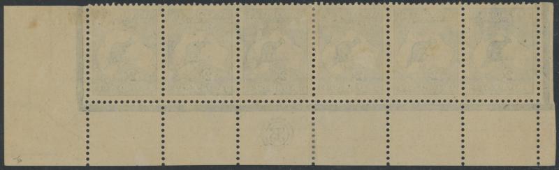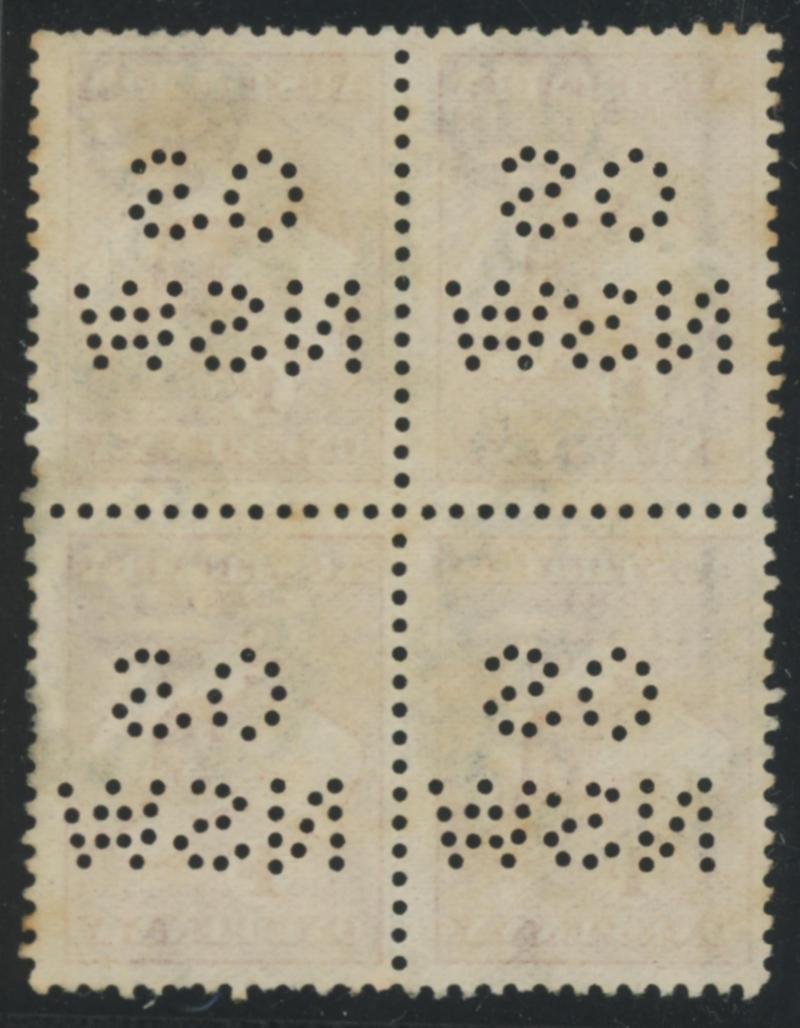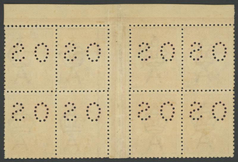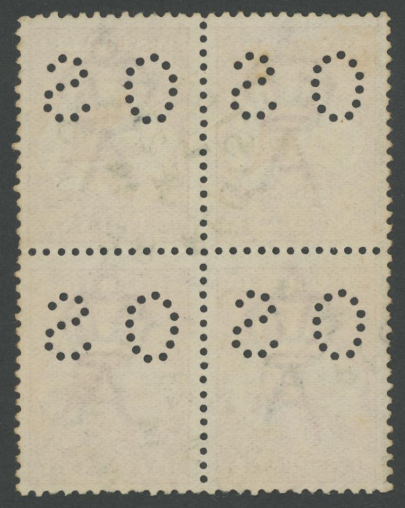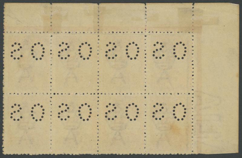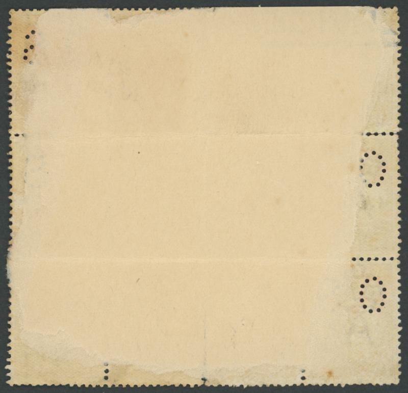 (First State) [Pos L55] ACSC 3(E)f, minor aging along the top of the upper units, the upper-right unit with some perf faults at right, fine 'NORTH ADELAIDE/24NO13/STH AUSTRALIA' cds cancels, Cat $240+ for singles. A very scarce multiple. Ex David
