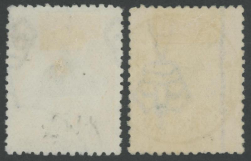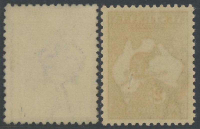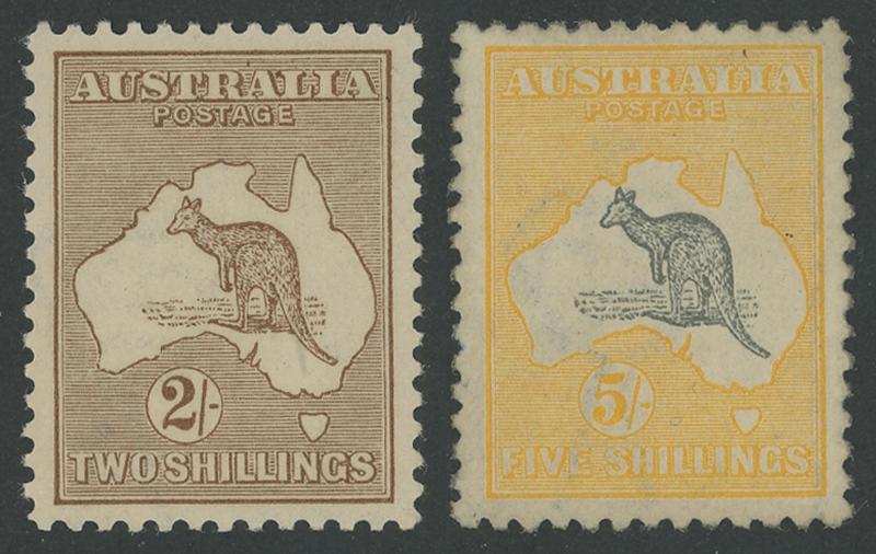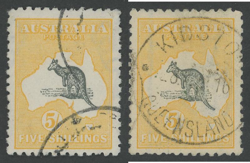 5/- grey & orange-yellow ACSC 43 (SG 30) and another with the Watermark Inverted 43a (30w), both well-centred, cds cancels, Cat