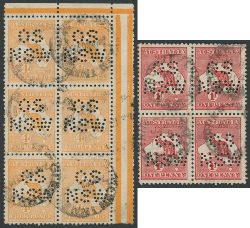 with some shortish perfs at left, light 'GLEN INNES/11NO1914/NSW' cds cancels, remarkably fine, plus 1d red Die II ACSC 3 (SG 2d) block of 4 with 'TRUNKLEY HALL/JA 8/1914/NSW' framed cds cancels, minor aging marks. Very scarce multiples. (2 blocks) (Image1) (Image2)