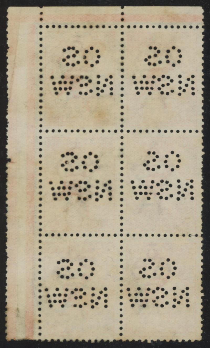 4d orange ACSC 15 (SG 6) marginal block of 6 (2x3) from the upper-right corner of the left-hand pane, quite well-centred, one unit