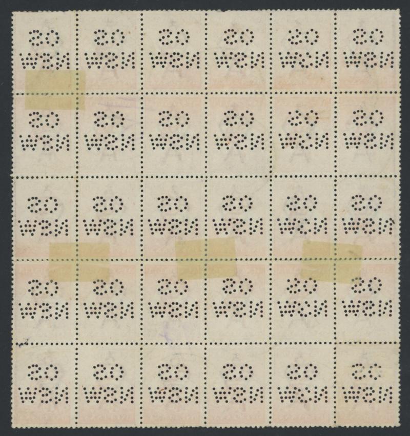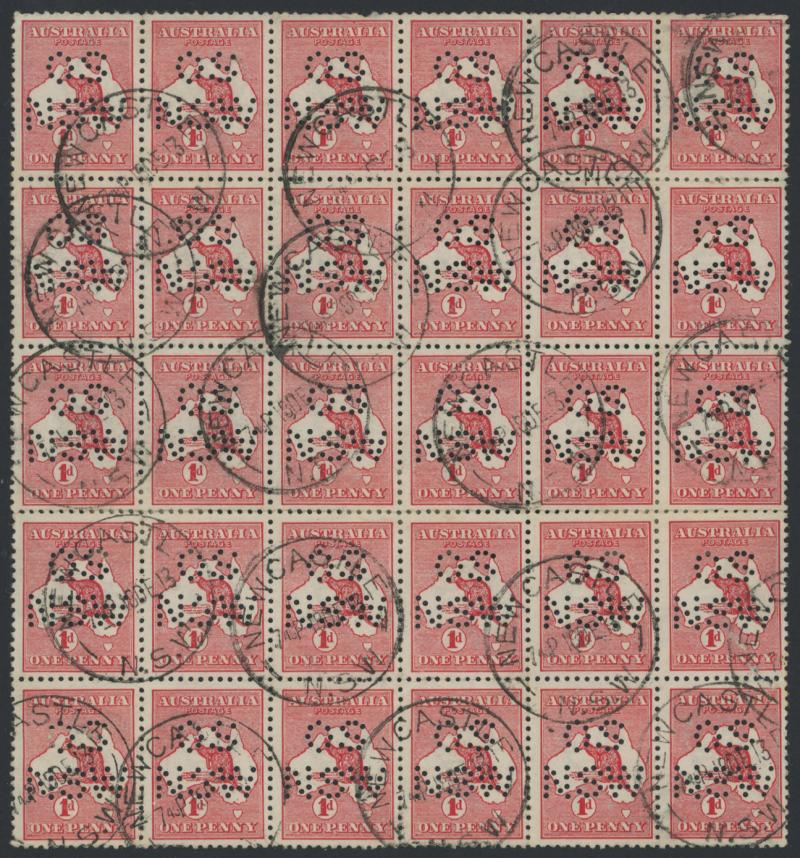 in Left Frame SW of WA [Pos L26] ACSC 2(C)e, a couple of units in the top row with minor perf faults, a little perf separation, multiple light 'NEWCASTLE/19DE13/N.S.W' cds cancels, Cat $100+ for unpunctured singles. An impressive used multiple. Ex