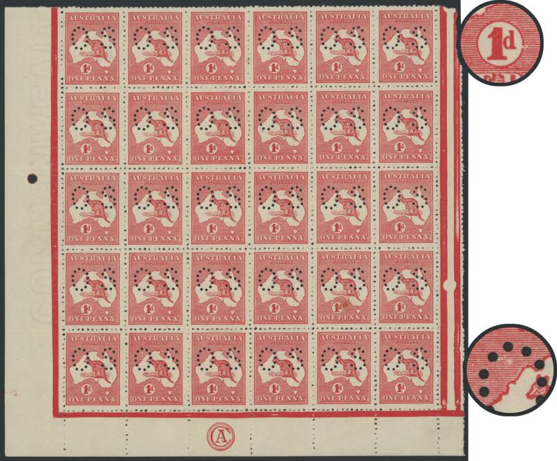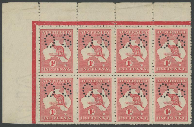 1d red Die I Plate C rejoined blocks of 18 (6x3) & 12 (6x2) with varieties White Flaw at Top of Kangaroo's Arm [Pos L4] and Notch