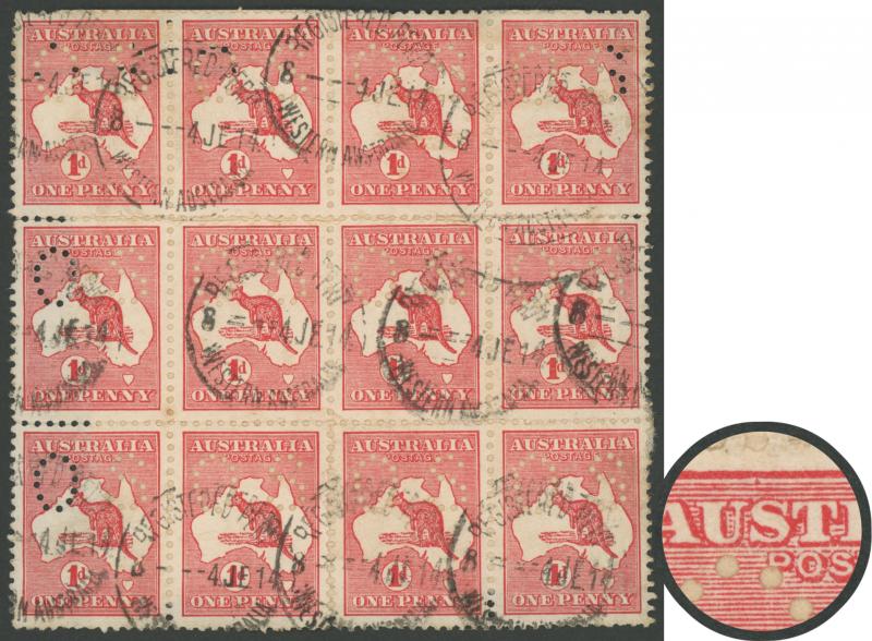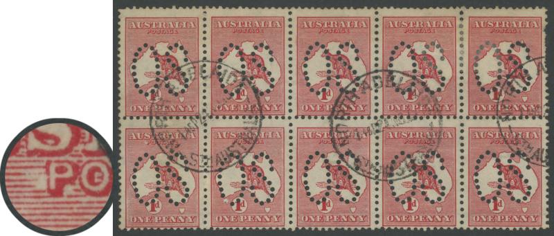 1d red Die II ACSC 3ba (SG O2d) Plate E block of 10 (5x2) the lower-left unit with Large White Flaw to left of 'P' of 'POSTAGE'