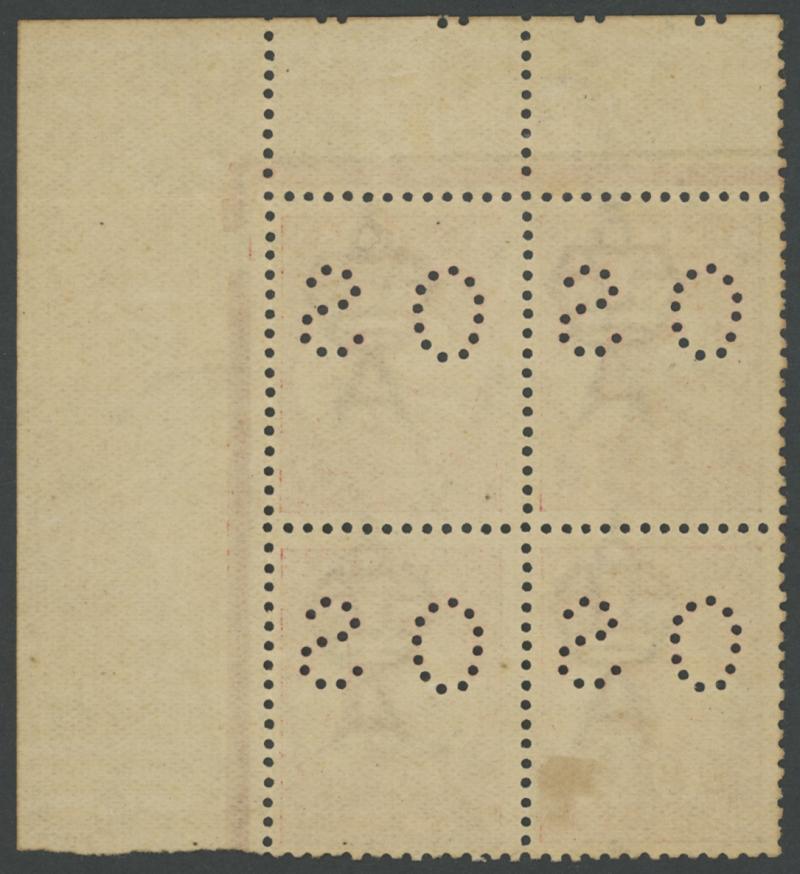 1d red Die IIA ACSC 4ba (SG O17e) Plate H 'CA' monogram corner strip of 3 ACSC 4(H)z in a block of 30 (6x5) comprising the lower