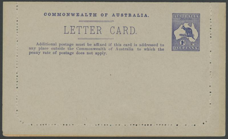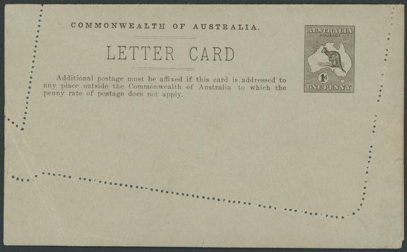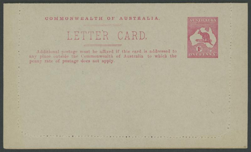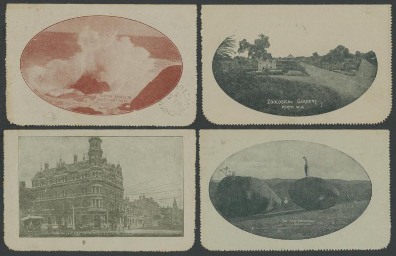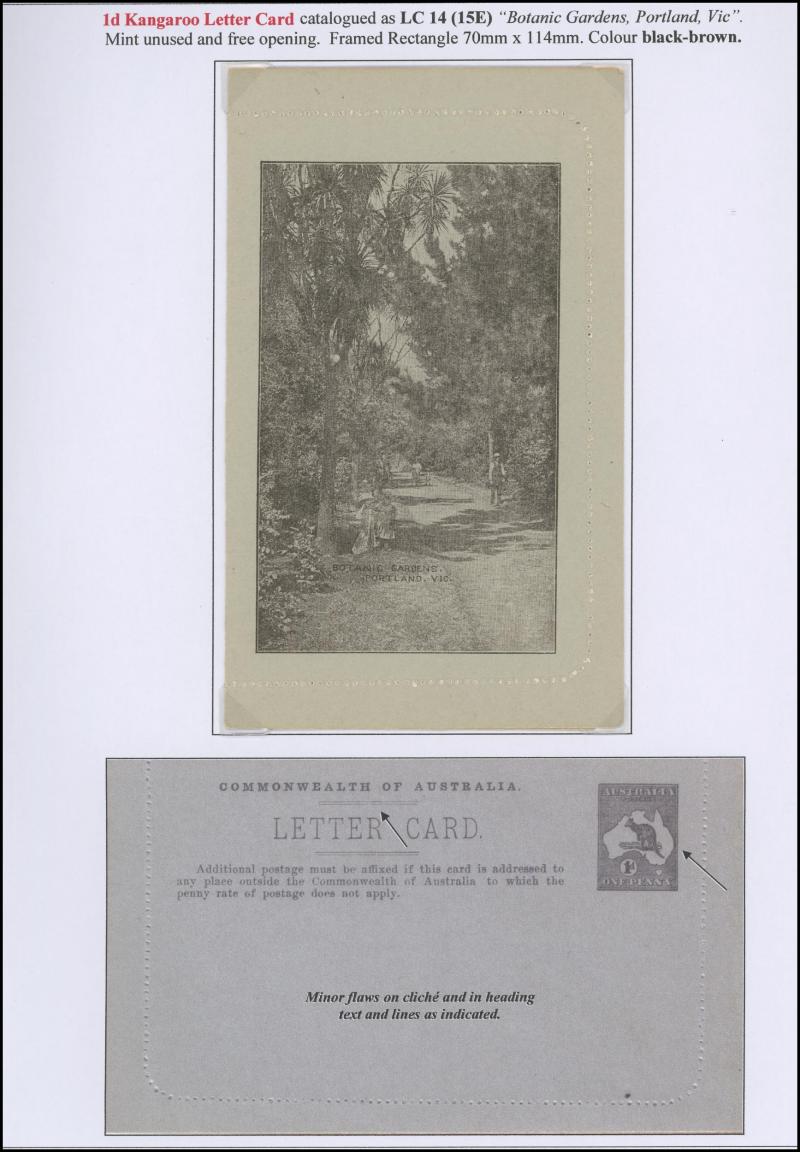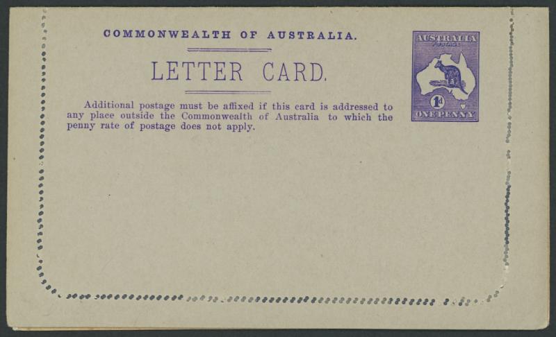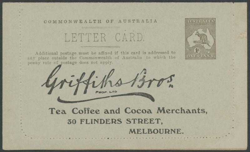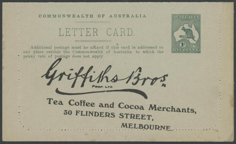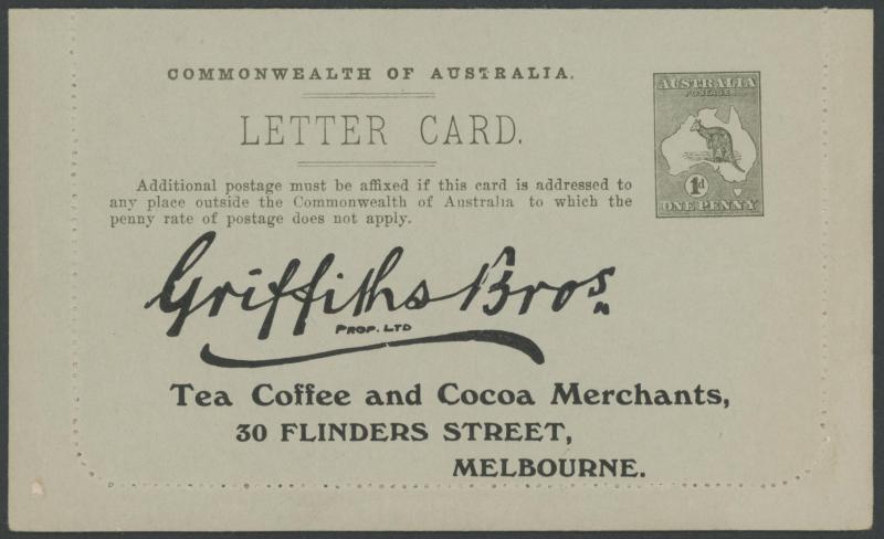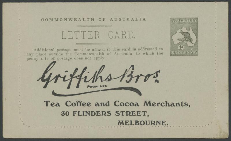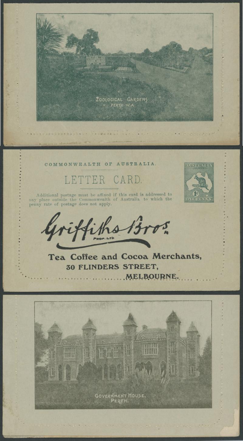 1243 PSE imageLETTER CARDS - SCENIC: Kangaroo 1d Original Die ACSC LC14 with pre-printed return address & payment advice form inside for Griffiths Bros, Tea Coffee & Cocoa Merchants, Mebourne comprising rectangular views 'NATIONAL PARK/N.S.WALES', 'THE TWO BROTHERS/QUEENSLAND', BOTANIC GARDENS/PORTLAND, VIC.', 'GOVERNMENT HOUSE/PERTH' & 'ZOOLOGICAL GARDENS/ PERTH W.A.', minor blemishes including gum loss where opened after adhesion, unused, Cat $850+ for normal. It is interesting that a high proportion of Griffiths cards have rectangular views. (5) (Image1) (Image2) (Image3) (Image4) (Image5) (Image6) (Image7) (Image8) (Image9) (Image10) (Image11) (Image12) (Image13)