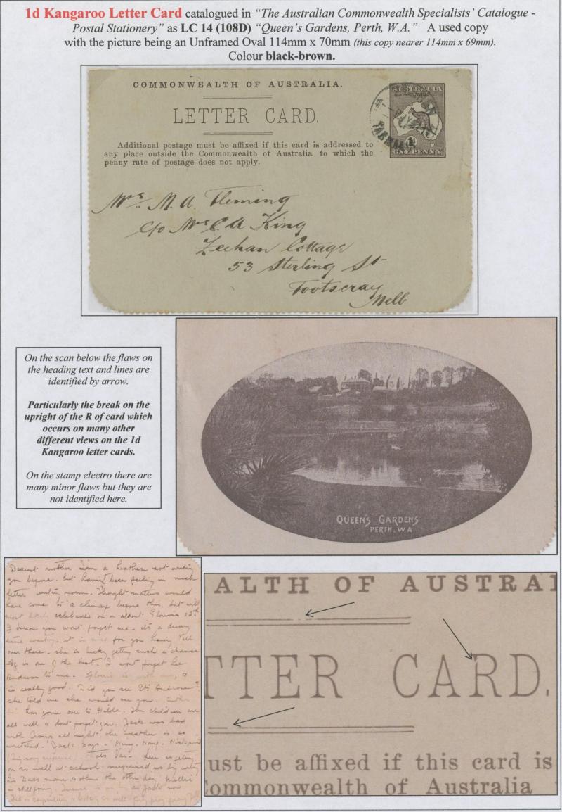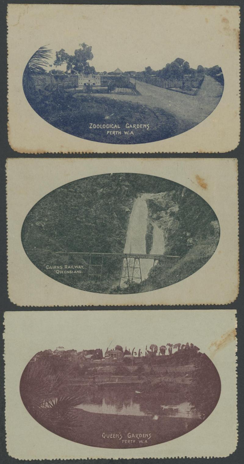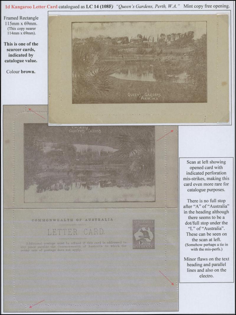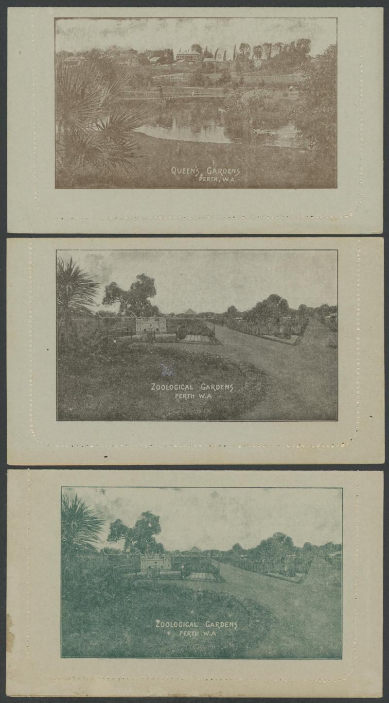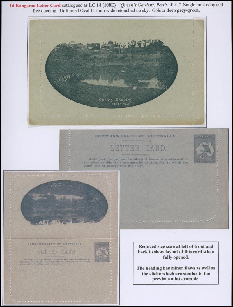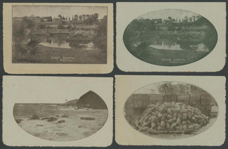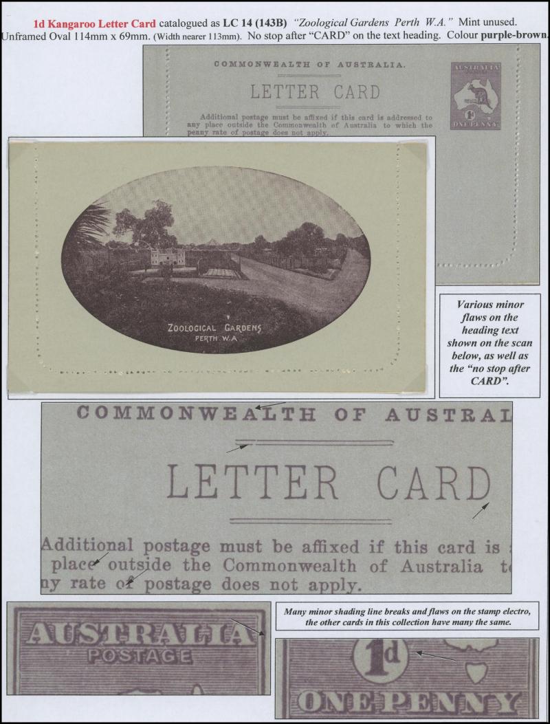 1243 PSE imageLETTER CARDS - SCENIC: Kangaroo 1d Original Die ACSC LC14 with pre-printed return address & payment advice form inside for Griffiths Bros, Tea Coffee & Cocoa Merchants, Mebourne comprising rectangular views 'NATIONAL PARK/N.S.WALES', 'THE TWO BROTHERS/QUEENSLAND', BOTANIC GARDENS/PORTLAND, VIC.', 'GOVERNMENT HOUSE/PERTH' & 'ZOOLOGICAL GARDENS/ PERTH W.A.', minor blemishes including gum loss where opened after adhesion, unused, Cat $850+ for normal. It is interesting that a high proportion of Griffiths cards have rectangular views. (5) (Image1) (Image2) (Image3) (Image4) (Image5) (Image6) (Image7) (Image8) (Image9) (Image10) (Image11) (Image12) (Image13)