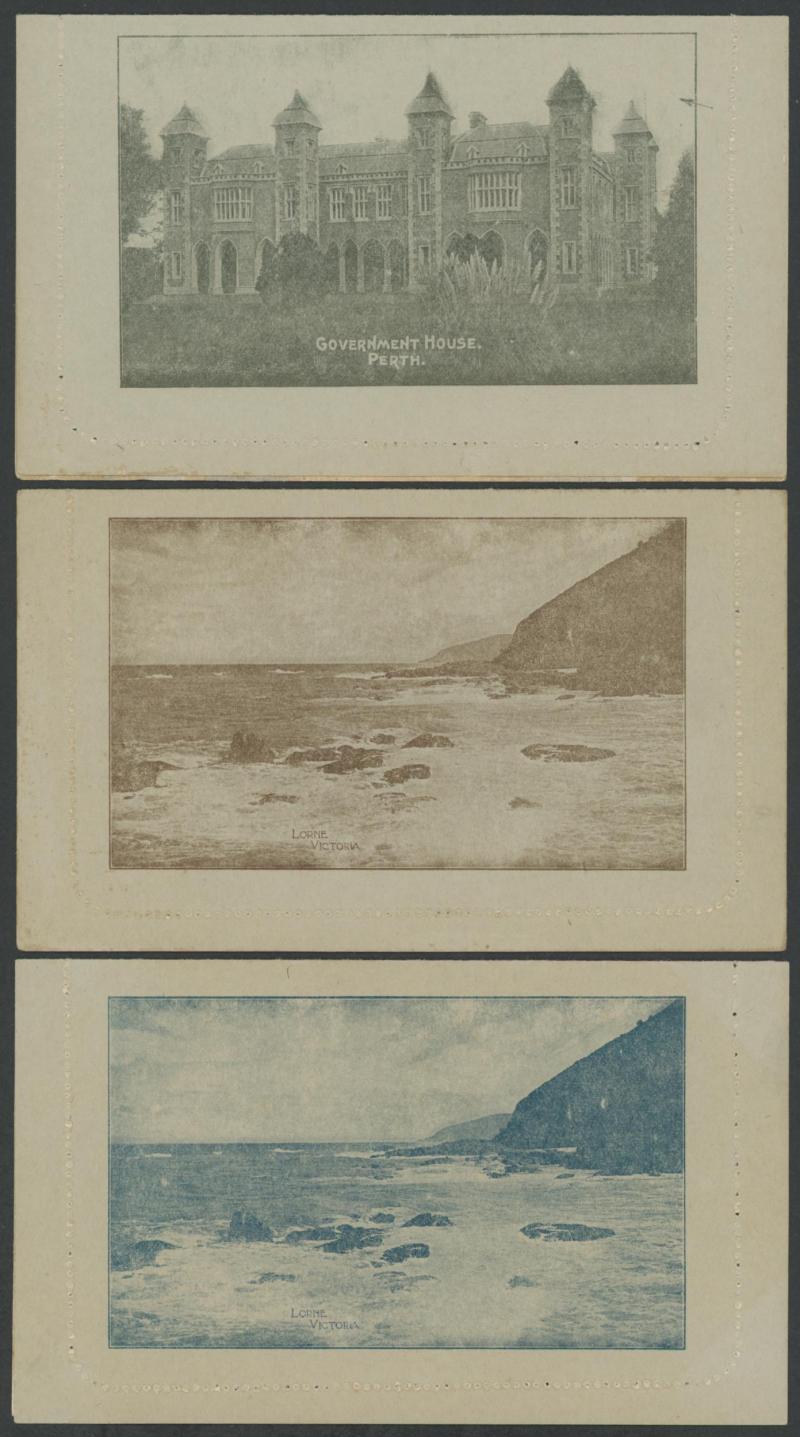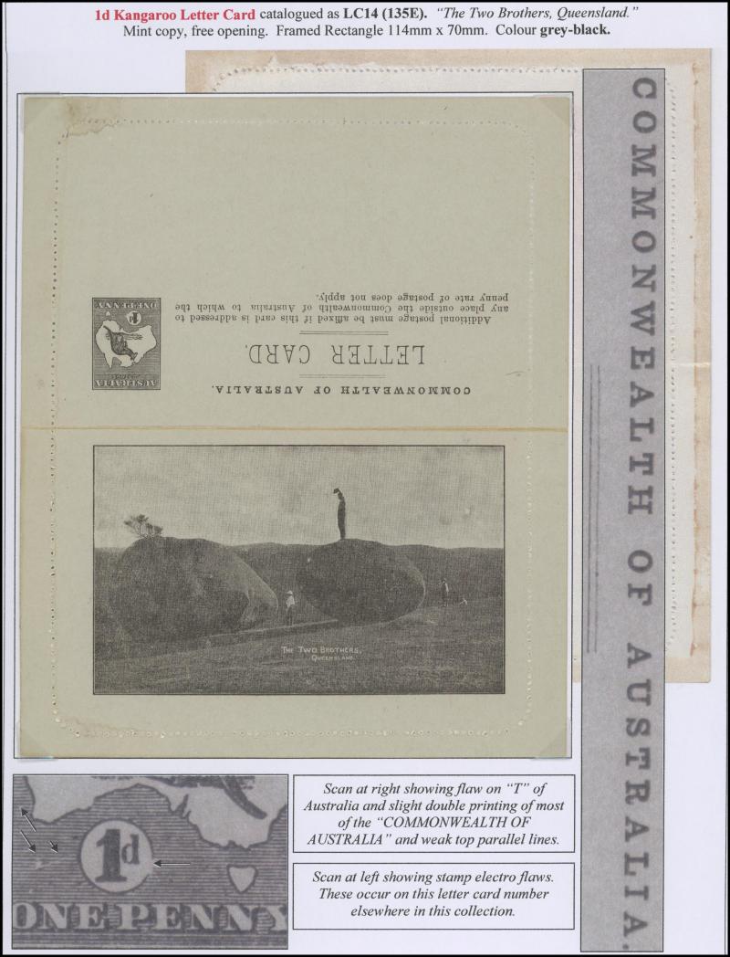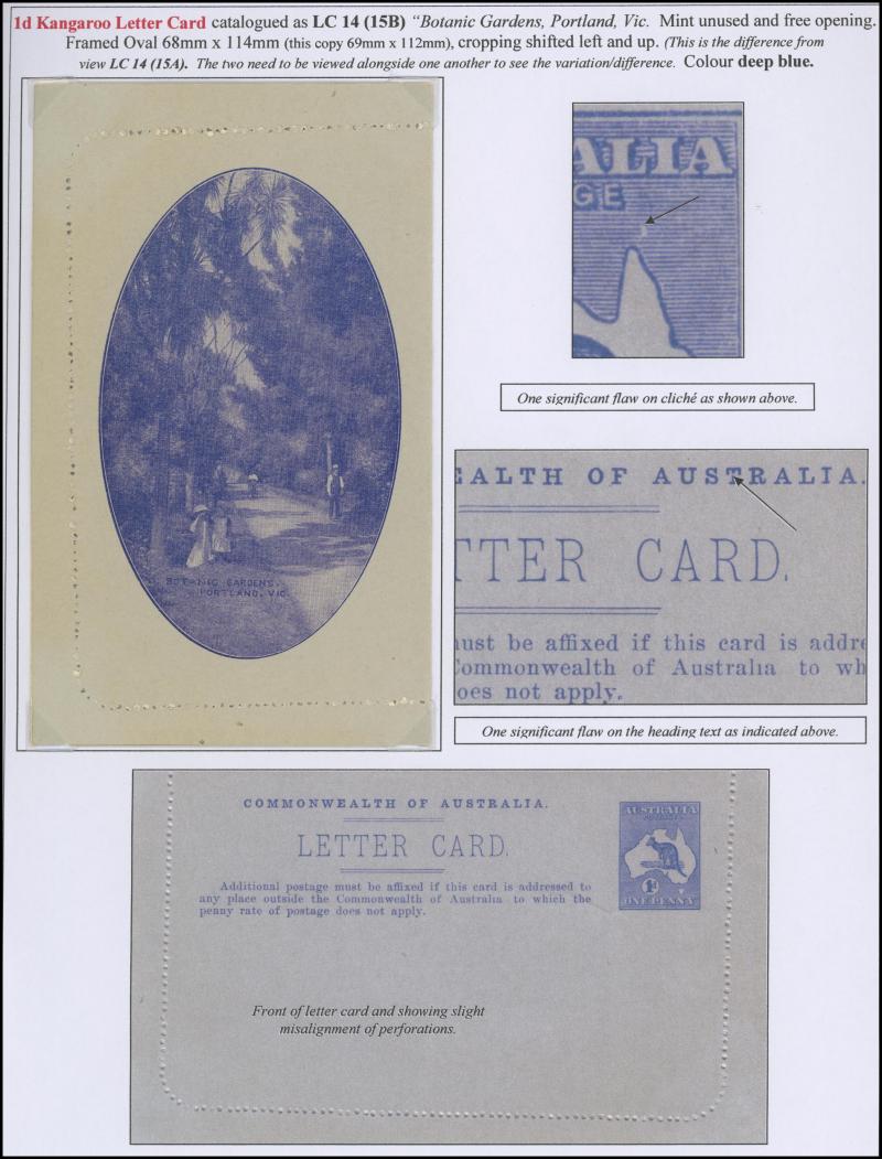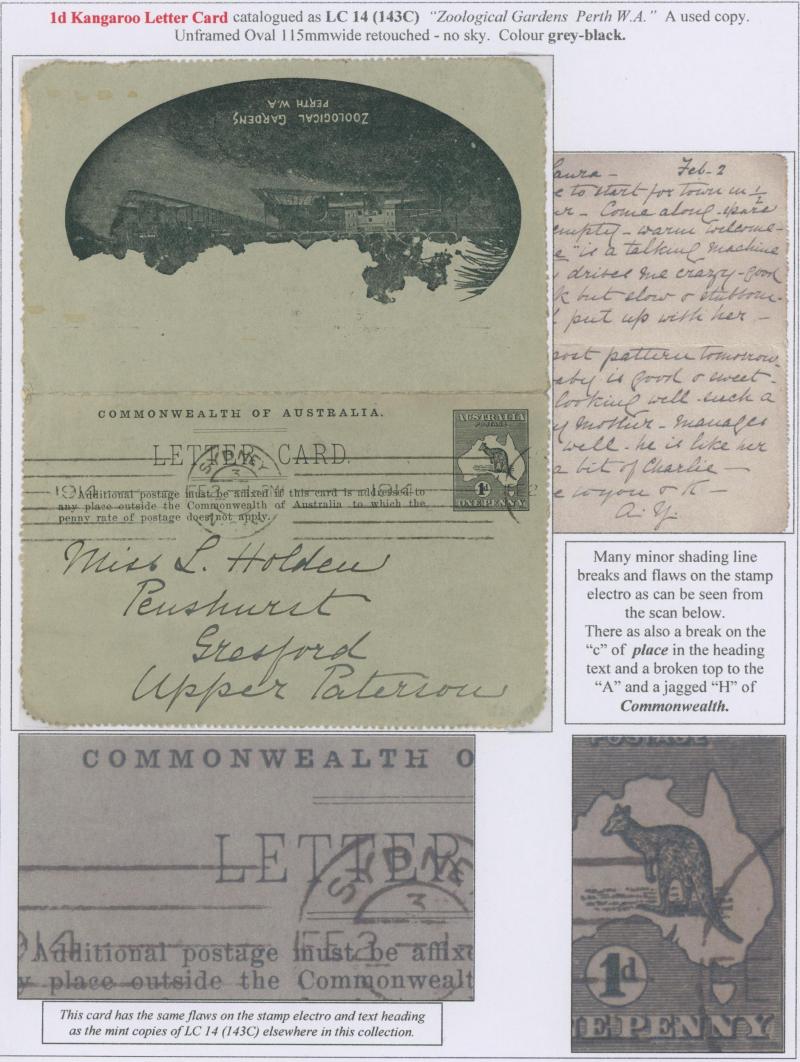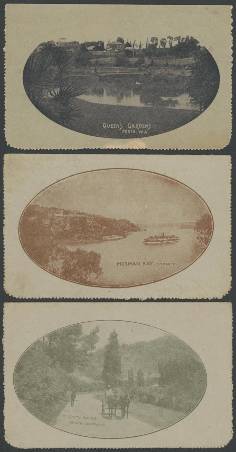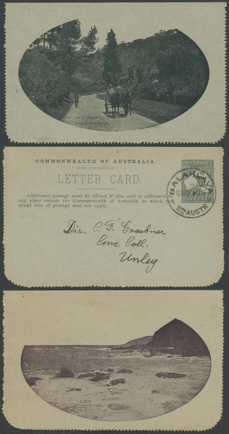 1243 PSE imageLETTER CARDS - SCENIC: Kangaroo 1d Original Die ACSC LC14 with pre-printed return address & payment advice form inside for Griffiths Bros, Tea Coffee & Cocoa Merchants, Mebourne comprising rectangular views 'NATIONAL PARK/N.S.WALES', 'THE TWO BROTHERS/QUEENSLAND', BOTANIC GARDENS/PORTLAND, VIC.', 'GOVERNMENT HOUSE/PERTH' & 'ZOOLOGICAL GARDENS/ PERTH W.A.', minor blemishes including gum loss where opened after adhesion, unused, Cat $850+ for normal. It is interesting that a high proportion of Griffiths cards have rectangular views. (5) (Image1) (Image2) (Image3) (Image4) (Image5) (Image6) (Image7) (Image8) (Image9) (Image10) (Image11) (Image12) (Image13)