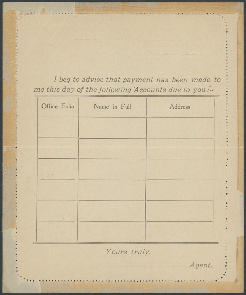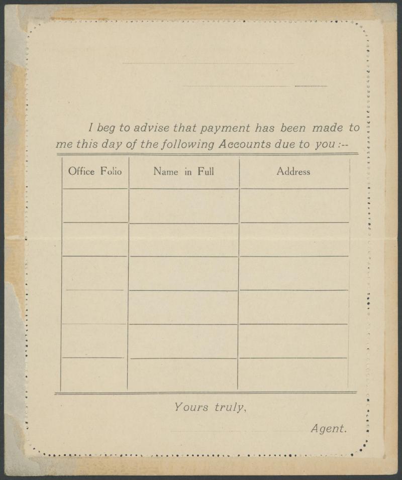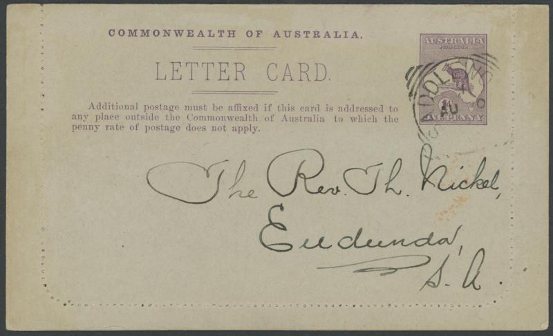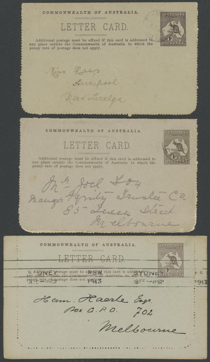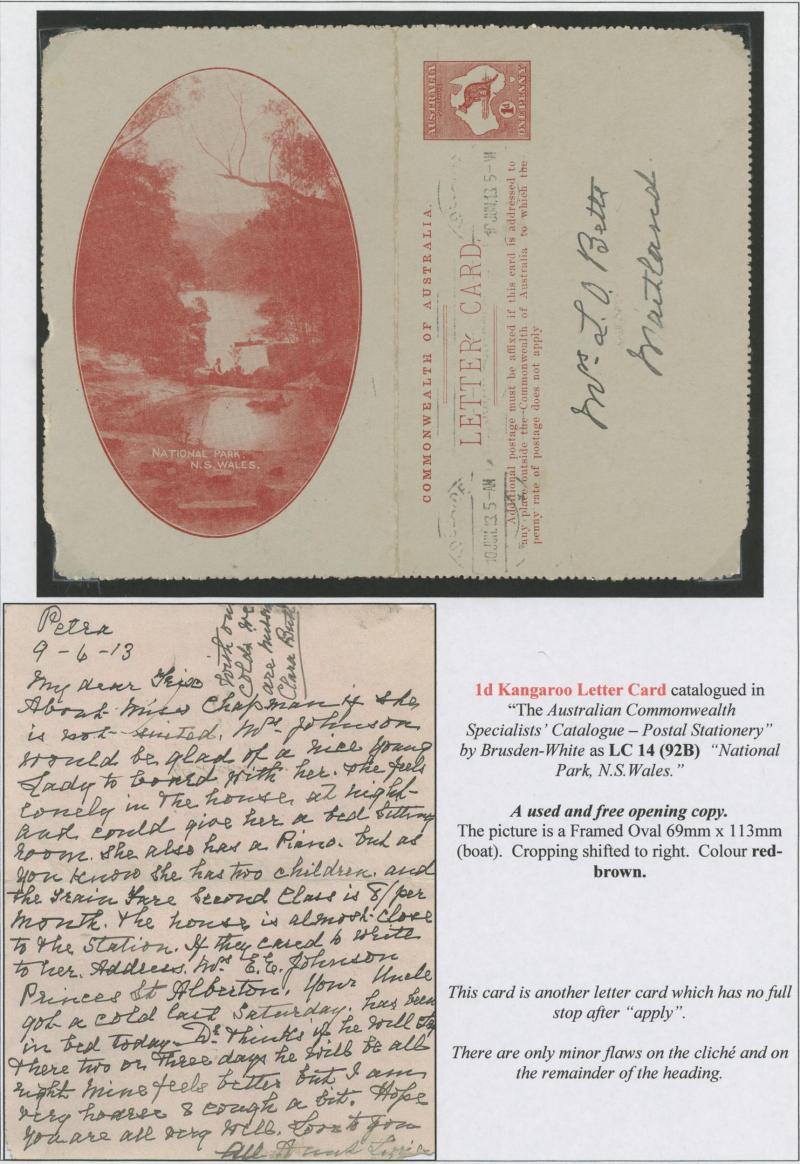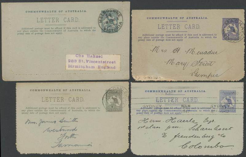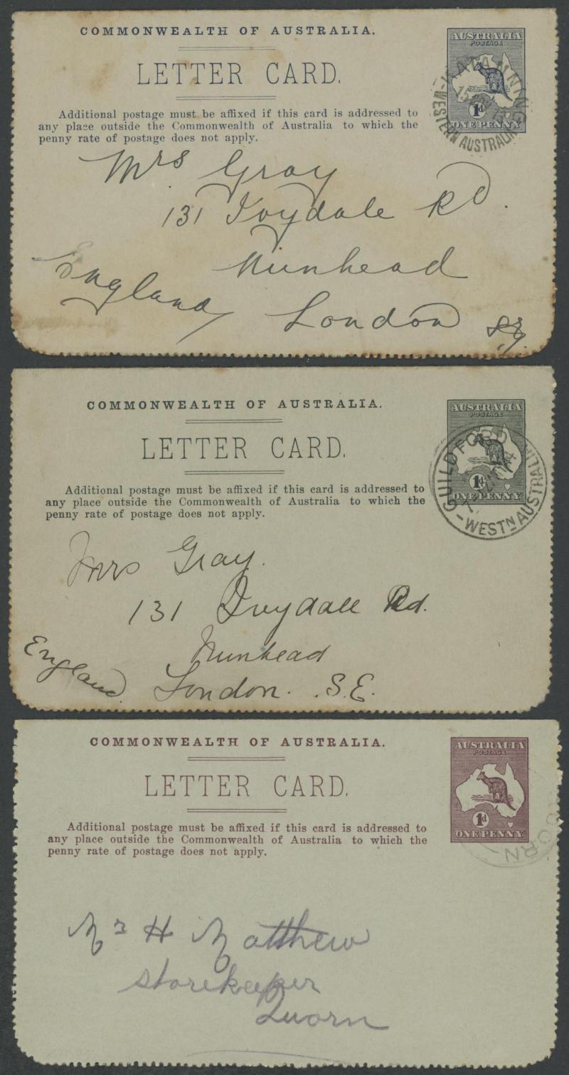 1243 PSE imageLETTER CARDS - SCENIC: Kangaroo 1d Original Die ACSC LC14 with pre-printed return address & payment advice form inside for Griffiths Bros, Tea Coffee & Cocoa Merchants, Mebourne comprising rectangular views 'NATIONAL PARK/N.S.WALES', 'THE TWO BROTHERS/QUEENSLAND', BOTANIC GARDENS/PORTLAND, VIC.', 'GOVERNMENT HOUSE/PERTH' & 'ZOOLOGICAL GARDENS/ PERTH W.A.', minor blemishes including gum loss where opened after adhesion, unused, Cat $850+ for normal. It is interesting that a high proportion of Griffiths cards have rectangular views. (5) (Image1) (Image2) (Image3) (Image4) (Image5) (Image6) (Image7) (Image8) (Image9) (Image10) (Image11) (Image12) (Image13)