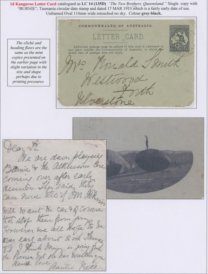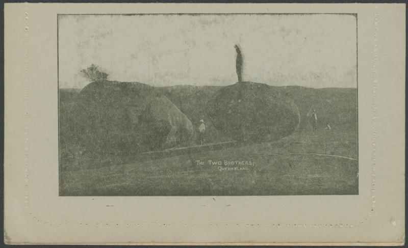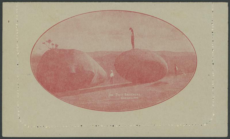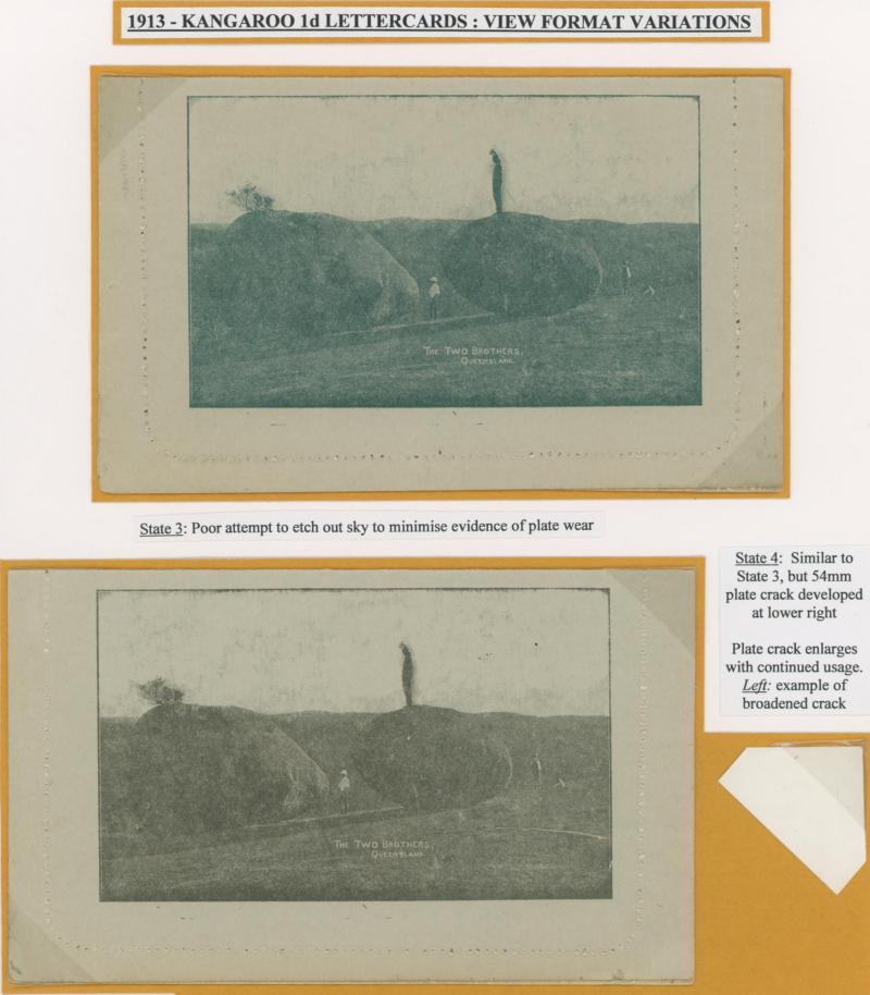1249 PSE imageLETTER CARDS - SCENIC: Kangaroo 1d 'THE TWO BROTHERS/QUEENSLAND' Deterioration of the Plate comprising Framed Oval x2 different depth of field, Unframed Oval, Part Oval Recut with the Sky & Part of the Border Removed, Rectangle x2, Rectangle Recut with the Sky Removed x2 (one with Plate Crack at lower-right), unused, Cat $1200. A technically interesting group. Sold at our auction of 25.3.2021 for $1315 (Sale 243 Lot 135). (8) (Image1) (Image2) (Image3) (Image4) (Image5)