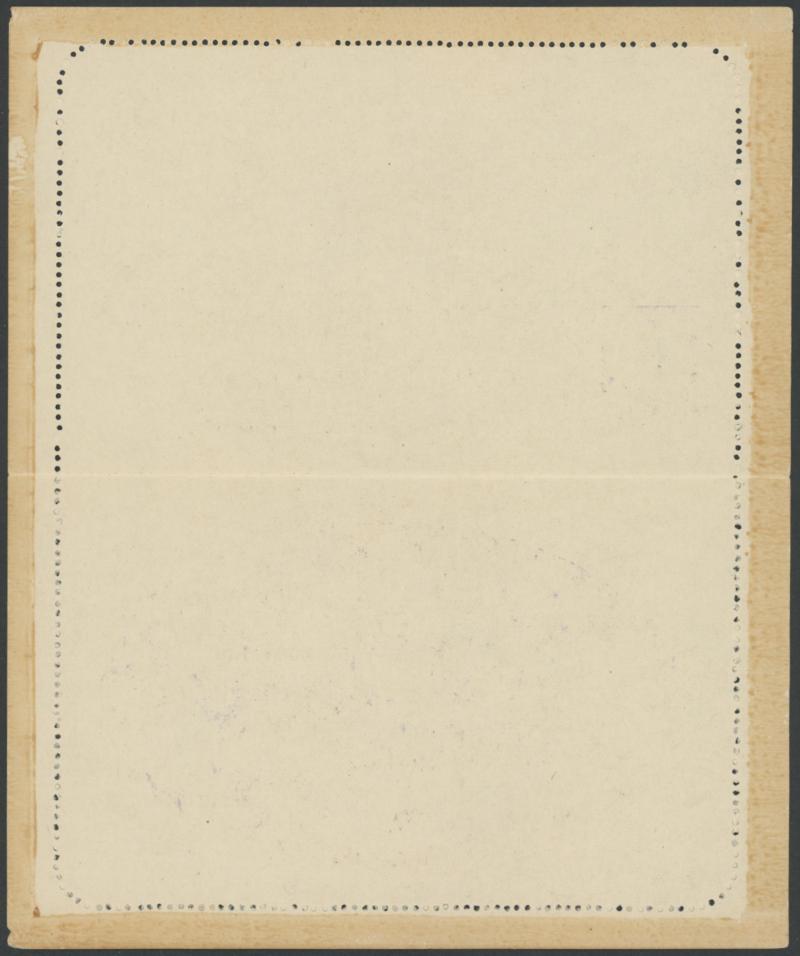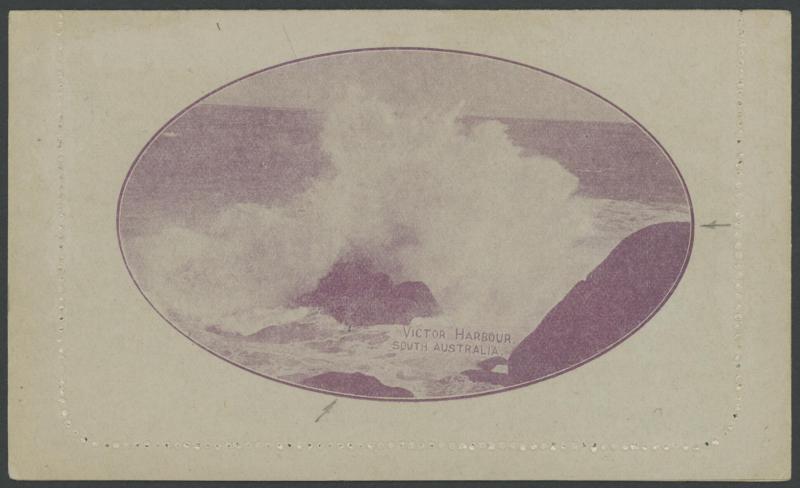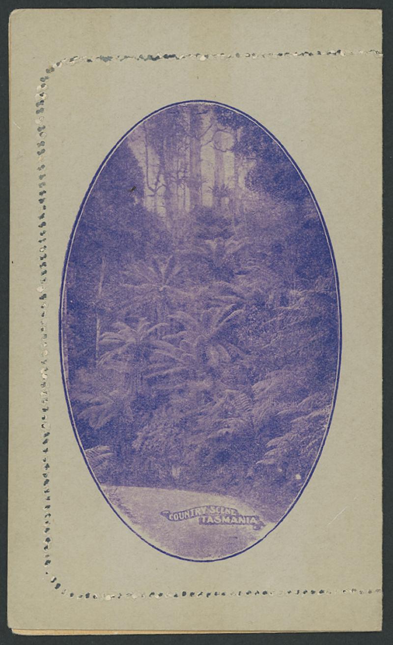 1247 PSE imageLETTER CARDS - SCENIC: Kangaroo 1d Original Die 'COUNTRY SCENE/TASMANIA' ACSC L14(43) in bright violet with Double Perforations, sensible perf reinforcement, unused, Cat $500+ for the scene/$300+ for double perforations. A rare view in the Kangaroo Series. Sold at our auction of 25.3.2021 for $808 (Sale 243 Lot 132). (Image1) (Image2)
