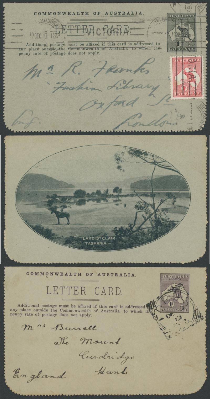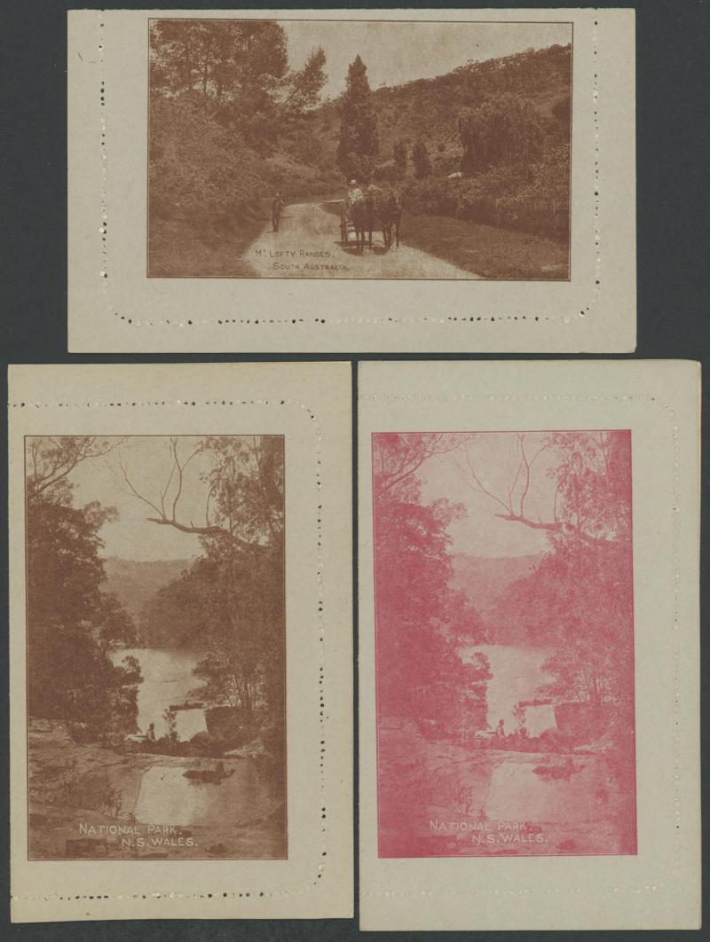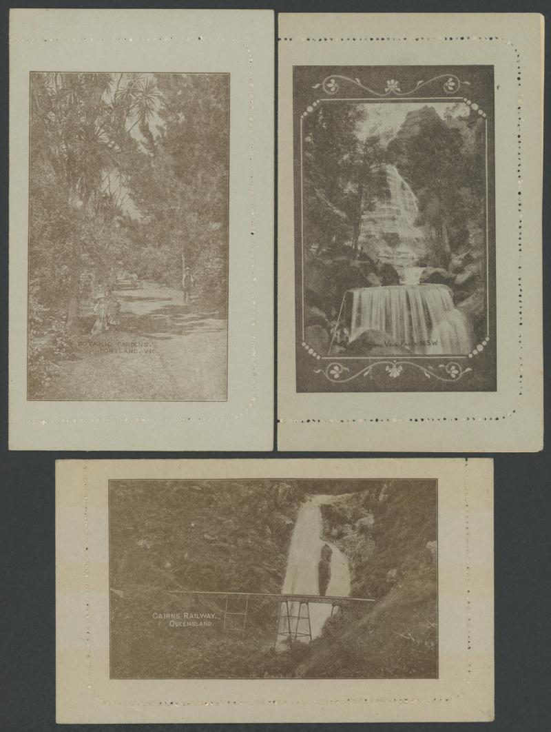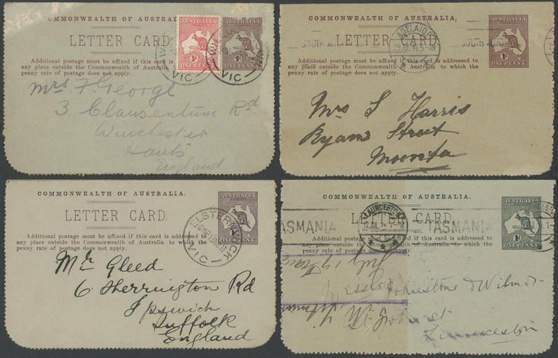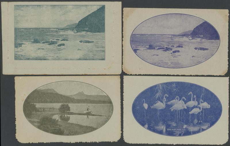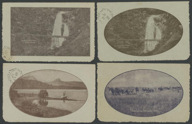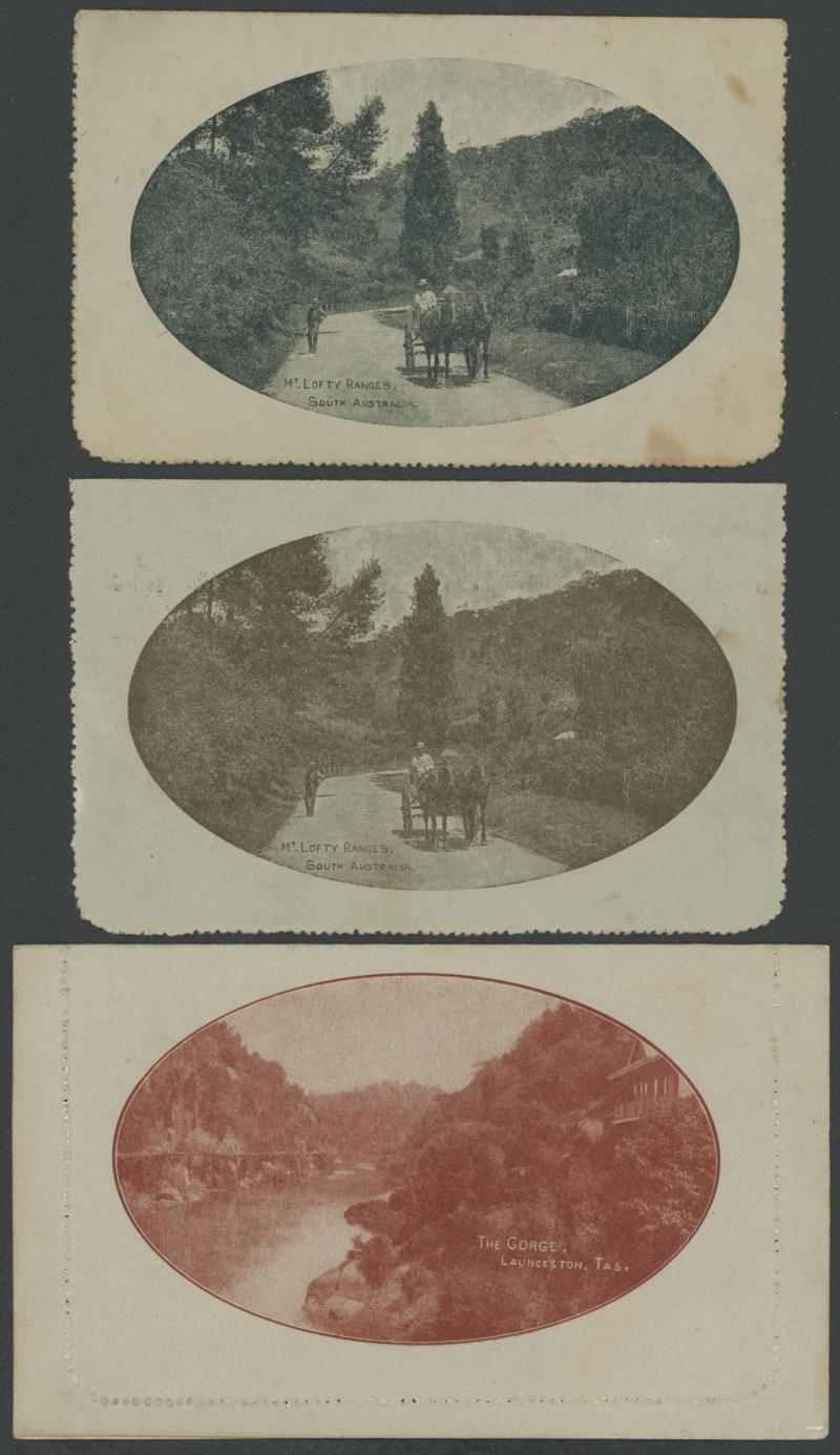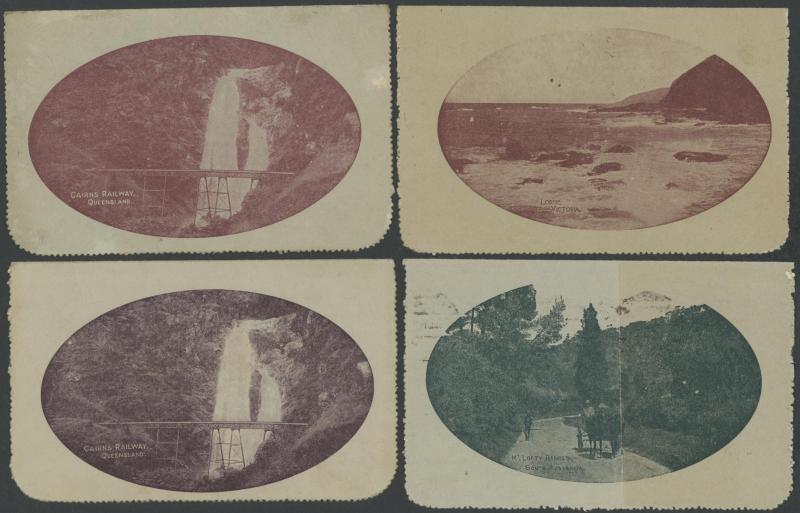 1250 PSE imageLETTER CARDS - SCENIC: Kangaroo 1d Die I ACSC LC15 used group comprising 'CAIRNS RAILWAY/QUEENSLAND' (bridge & waterfall) x3 one to England with Kangaroo 1d red added (faults), 'GEELONG HARBOUR' (sun-tanned), 'LAKE ST CLAIR/TASMANIA (very fine), 'LORNE/VICTORIA' with & without sky the latter with fine 'FORDS/SA' squared circle cancel, 'MT LOFTY RANGES/SOUTH AUSTRALIA' (horse & buggy) to England with Kangaroo 1d red added plus another to Tasmania (heavy fold), 'WATERFALL GULLY/ADELAIDE' etc, all commercially or socially used, condition variable, Cat $500+. Ex David Adams, some on his pages with copious notes on value indicia & other printing varieties. (10) (Image1) (Image2) (Image3) (Image4) (Image5) (Image6) (Image7) (Image8) (Image9) (Image10)