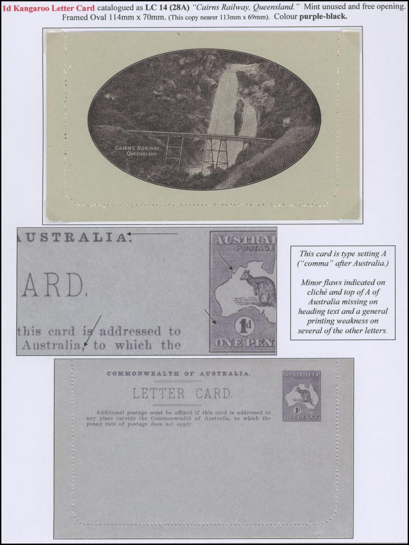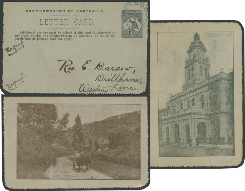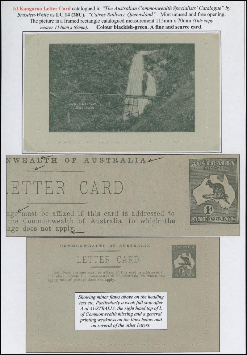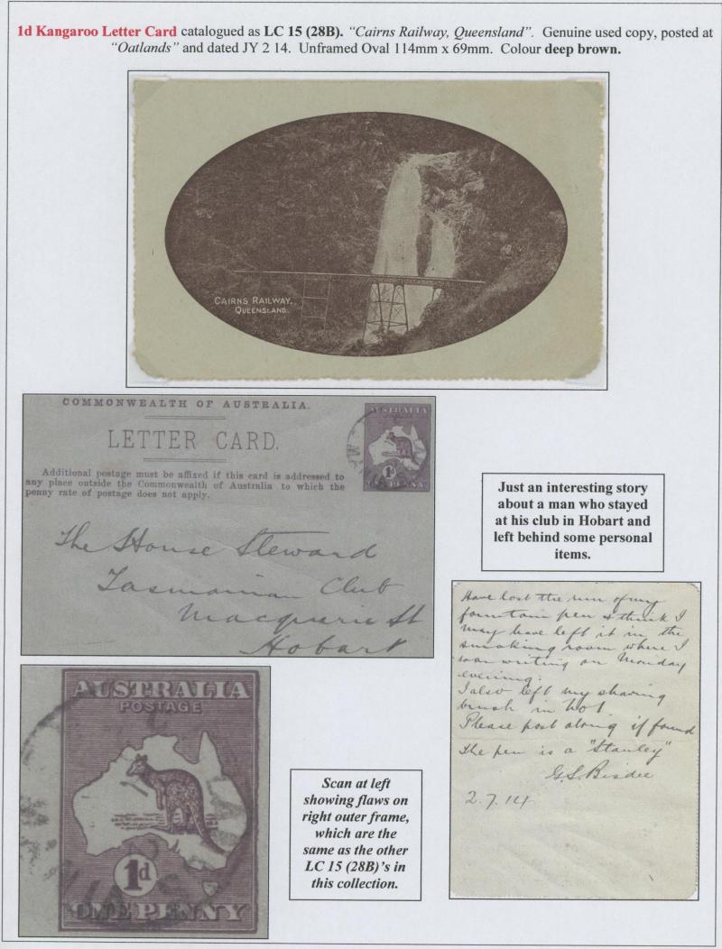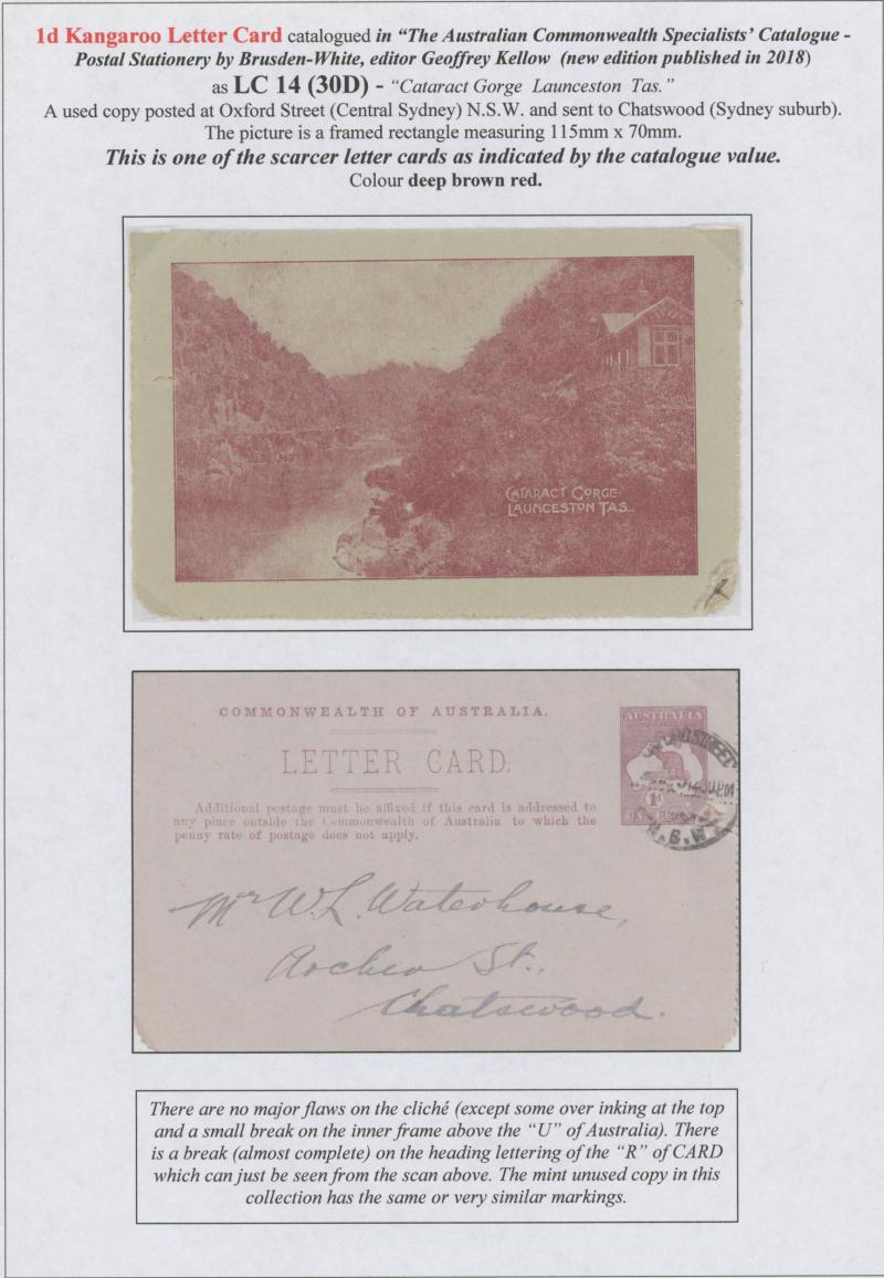 1241 PSE imageLETTER CARDS - SCENIC: Kangaroo 1d Original Die ACSC LC14 used group including 'CATARACT GORGE/LAUNCESTONO TAS.' rectangular view (corner fault), 'CAIRNS RAILWAY/QUEENSLAND' (bridge & waterfall), 'CENTRAL RLY STN/BRISBANE' rectangular view, 'LORNE/VICTORIA' rectangular view, 'MT LOFTY RANGES/SOUTH AUSTRALIA' rectangular view (horse & buggy; minor edge fault), 'ST GEORGES TERRACE PERTH' to "Drillham, Western Line" with 'NOBBY' (Qld) cds in blue, etc, good range of colours, most commercially or socially used, condition variable but many are fine to very fine, Cat $1500+. Ex David Adams, some on his pages with copious notes on value indicia & other printing varieties. (30) (Image1) (Image2) (Image3) (Image4) (Image5) (Image6) (Image7) (Image8) (Image9) (Image10) (Image11) (Image12) (Image13) (Image14) (Image15) (Image16) (Image17) (Image18) (Image19) (Image20) (Image21) (Image22) (Image23) (Image24) (Image25) (Image26) (Image27) (Image28)