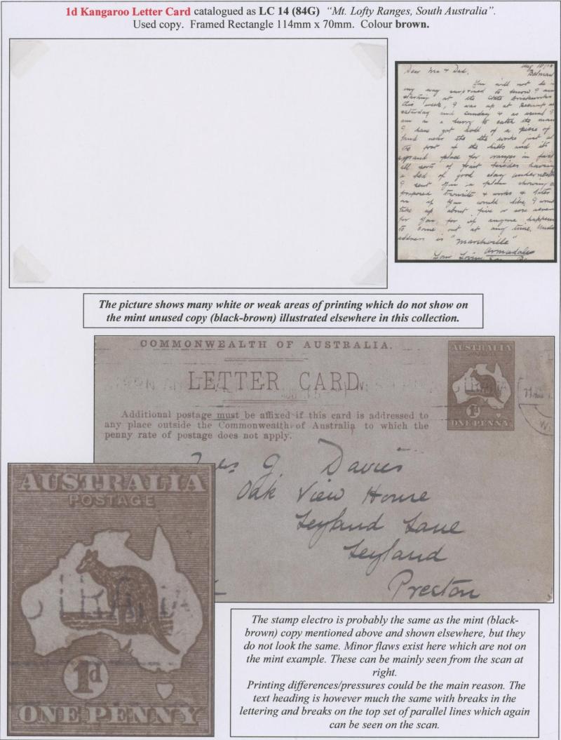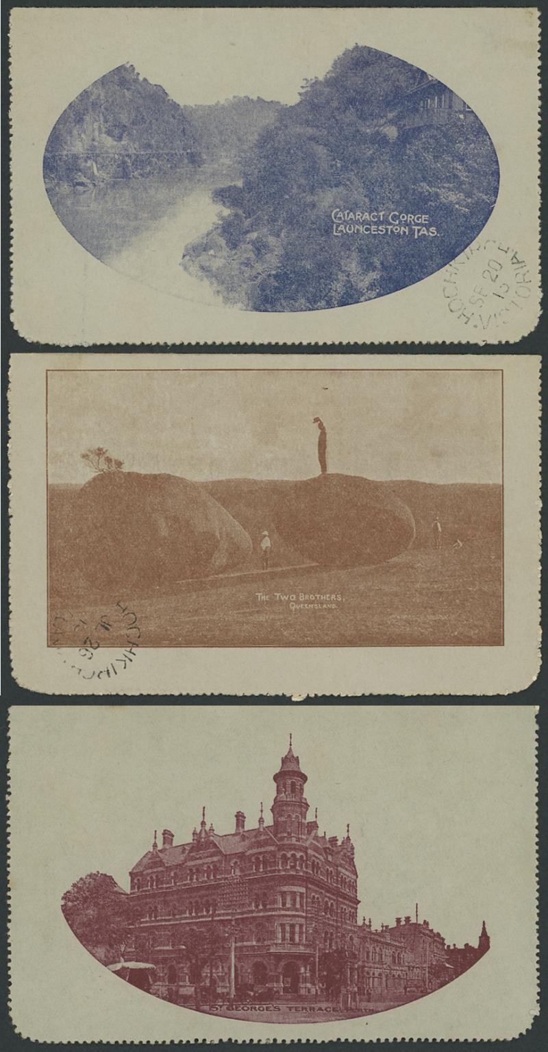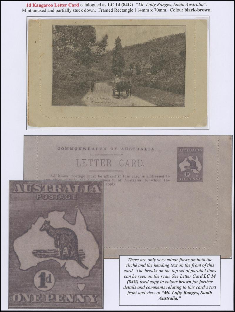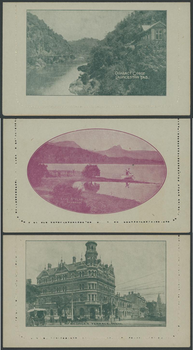 1241 PSE imageLETTER CARDS - SCENIC: Kangaroo 1d Original Die ACSC LC14 used group including 'CATARACT GORGE/LAUNCESTONO TAS.' rectangular view (corner fault), 'CAIRNS RAILWAY/QUEENSLAND' (bridge & waterfall), 'CENTRAL RLY STN/BRISBANE' rectangular view, 'LORNE/VICTORIA' rectangular view, 'MT LOFTY RANGES/SOUTH AUSTRALIA' rectangular view (horse & buggy; minor edge fault), 'ST GEORGES TERRACE PERTH' to "Drillham, Western Line" with 'NOBBY' (Qld) cds in blue, etc, good range of colours, most commercially or socially used, condition variable but many are fine to very fine, Cat $1500+. Ex David Adams, some on his pages with copious notes on value indicia & other printing varieties. (30) (Image1) (Image2) (Image3) (Image4) (Image5) (Image6) (Image7) (Image8) (Image9) (Image10) (Image11) (Image12) (Image13) (Image14) (Image15) (Image16) (Image17) (Image18) (Image19) (Image20) (Image21) (Image22) (Image23) (Image24) (Image25) (Image26) (Image27) (Image28)