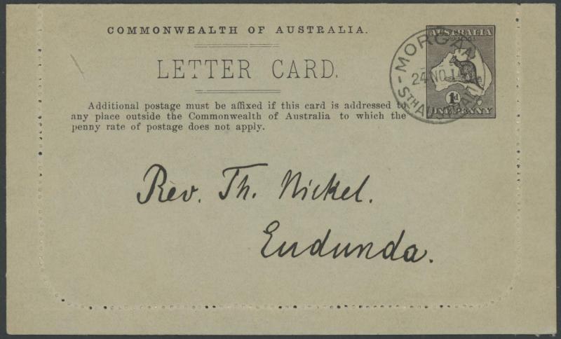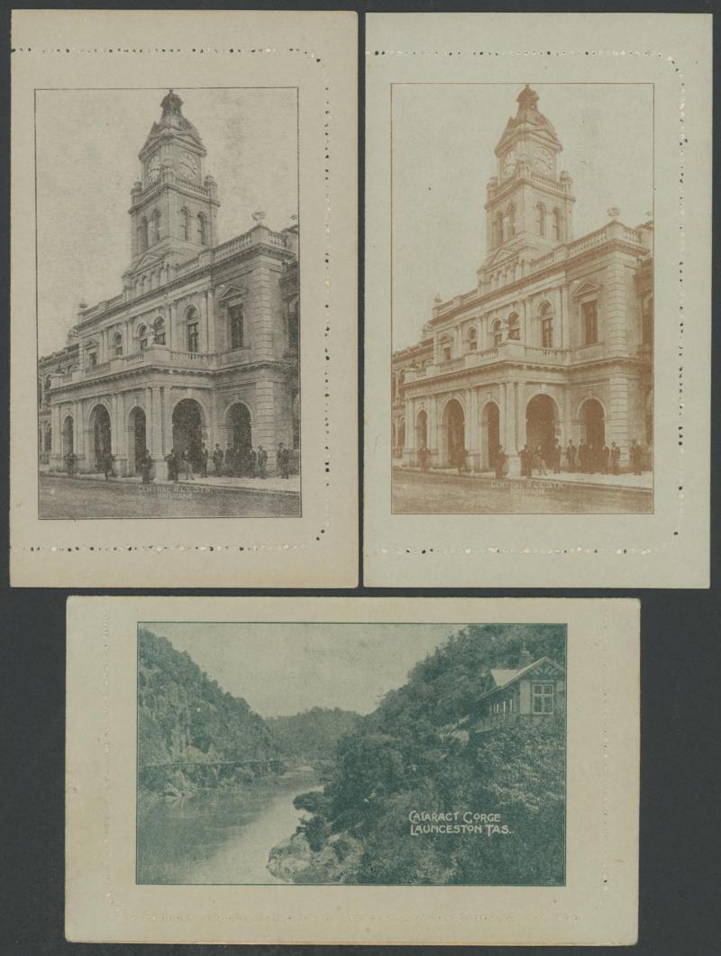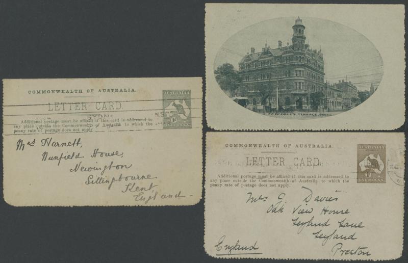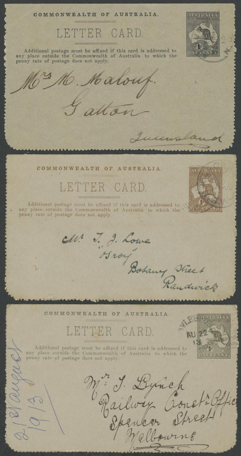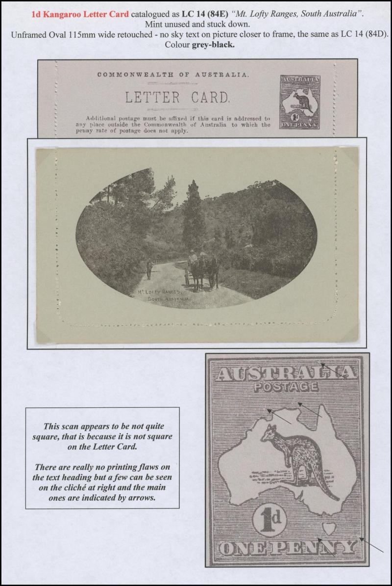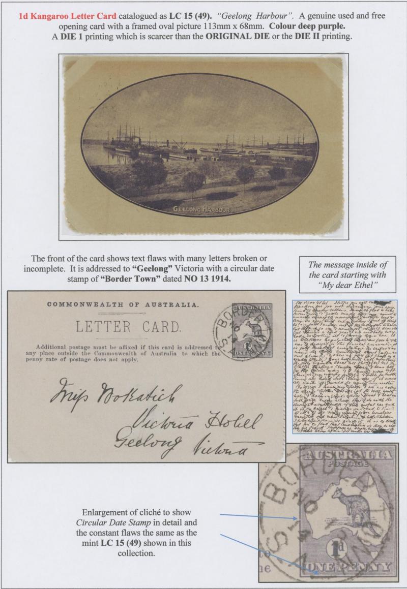 1241 PSE imageLETTER CARDS - SCENIC: Kangaroo 1d Original Die ACSC LC14 used group including 'CATARACT GORGE/LAUNCESTONO TAS.' rectangular view (corner fault), 'CAIRNS RAILWAY/QUEENSLAND' (bridge & waterfall), 'CENTRAL RLY STN/BRISBANE' rectangular view, 'LORNE/VICTORIA' rectangular view, 'MT LOFTY RANGES/SOUTH AUSTRALIA' rectangular view (horse & buggy; minor edge fault), 'ST GEORGES TERRACE PERTH' to "Drillham, Western Line" with 'NOBBY' (Qld) cds in blue, etc, good range of colours, most commercially or socially used, condition variable but many are fine to very fine, Cat $1500+. Ex David Adams, some on his pages with copious notes on value indicia & other printing varieties. (30) (Image1) (Image2) (Image3) (Image4) (Image5) (Image6) (Image7) (Image8) (Image9) (Image10) (Image11) (Image12) (Image13) (Image14) (Image15) (Image16) (Image17) (Image18) (Image19) (Image20) (Image21) (Image22) (Image23) (Image24) (Image25) (Image26) (Image27) (Image28)