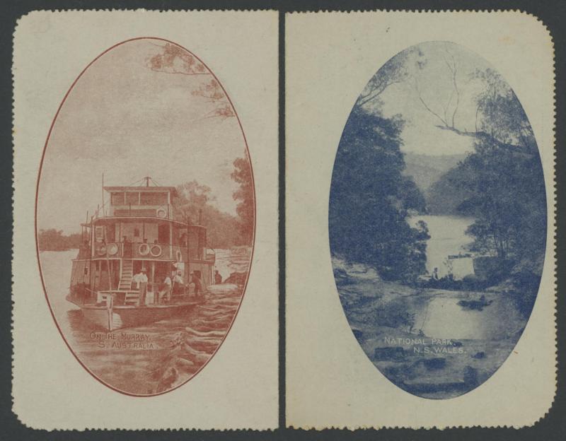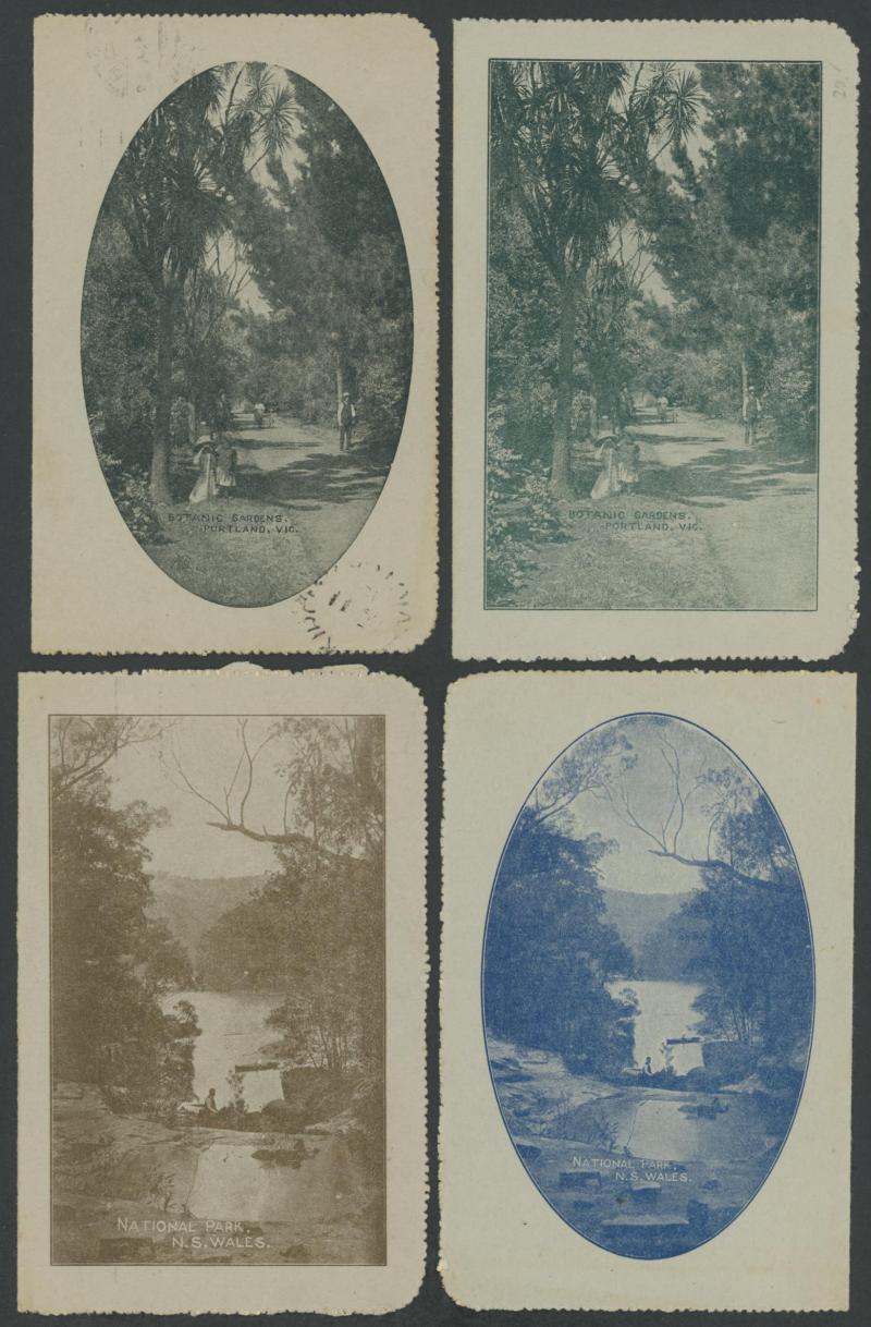 1240 PSE imageLETTER CARDS - SCENIC: Kangaroo 1d postally used group including 'BOTANIC GARDENS/PORTLAND VIC' (rectangular), 'CAIRNS RAILWAY/...' (rectangular), 'CATARACT GORGE' (part-oval), 'HARVESTING TAMWORTH', 'NATIONAL PARK/NS WALES' (vertical, with boat x3 different, including rectangular), 'ON THE MURRAY, 'QUEEN'S GARDENS' (rectangular), 'ST GEORGE'S TERRACE PERTH' (part-oval & rectangular), 'THE TWO BROTHERS' (rectangular) and 'ZOOLOGICAL GARDENS/PERTH WA' (part-oval), etc, generally very fine unused. Generally scarcer than unused examples.  (21) (Image1) (Image2) (Image3) (Image4) (Image5) (Image6)