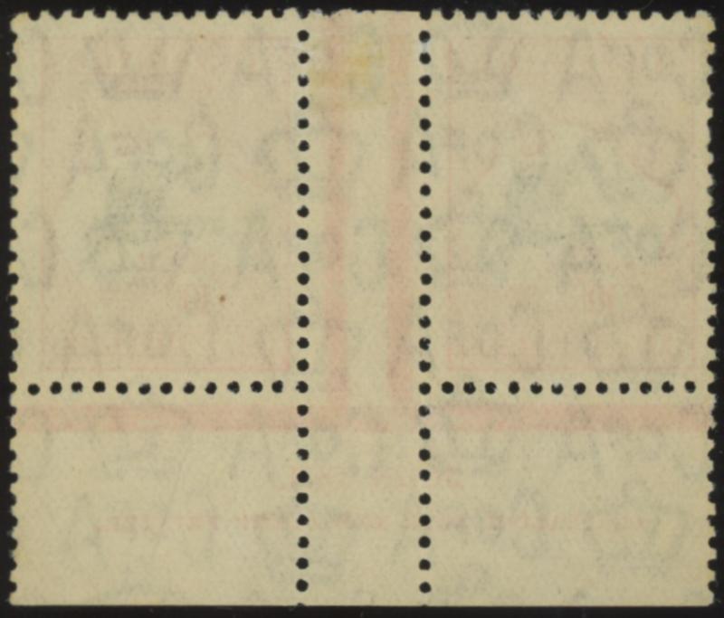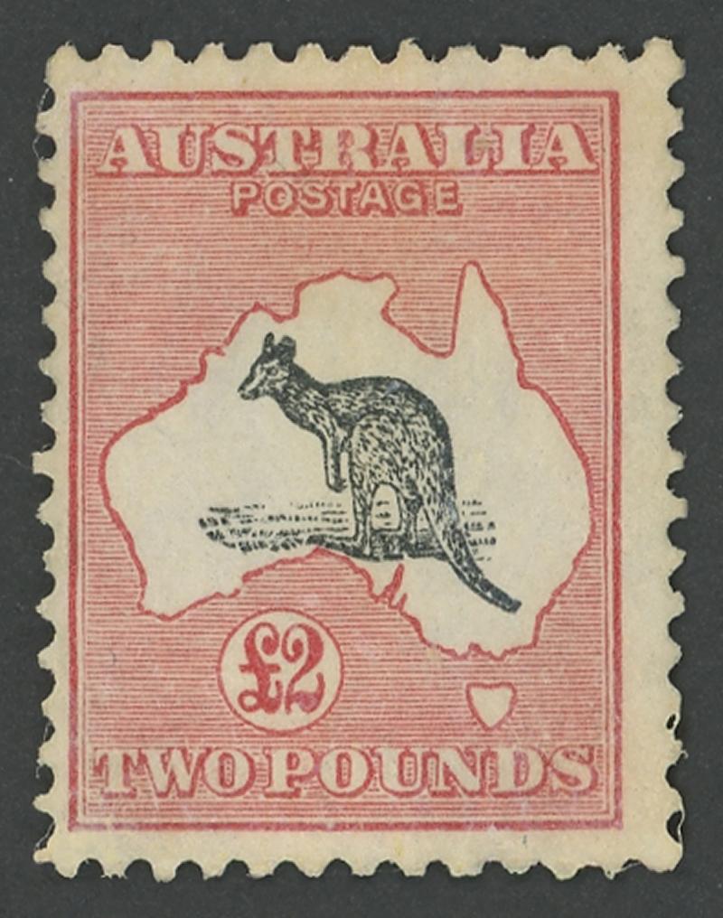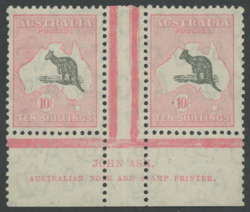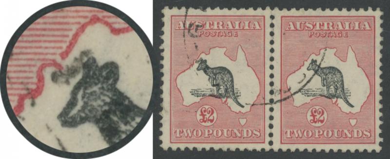 1237 F image£2 black & rose-carmine ACSC 58 (SG 138) horizontal pair, the left-hand unit with Break in WA Coast by Kangaroo's Ears [Pos L13] #58(D)e, well-centred, light GPO Sydney cds, Cat $2200+ for singles (£1300+ for normal singles). A scarce and superb multiple. (Image1) (Image2)