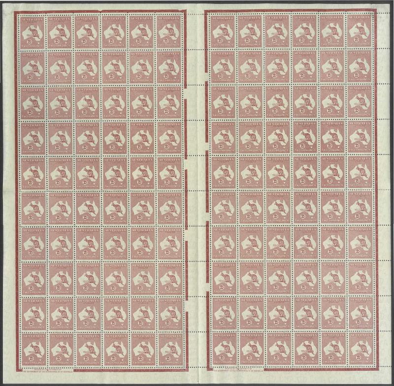 1233 nh/og image2/- maroon Redrawn Die ACSC 41 (SG 212) complete sheet of 120 (12x10) with Authority Imprints 41z & zb, most units are very well-centred, some perf separation but virtually all units are unmounted, Cat $2390+ for the imprint blocks and 112 singles. A common stamp but a scarce sheet. (Image1) (Image2)