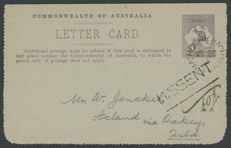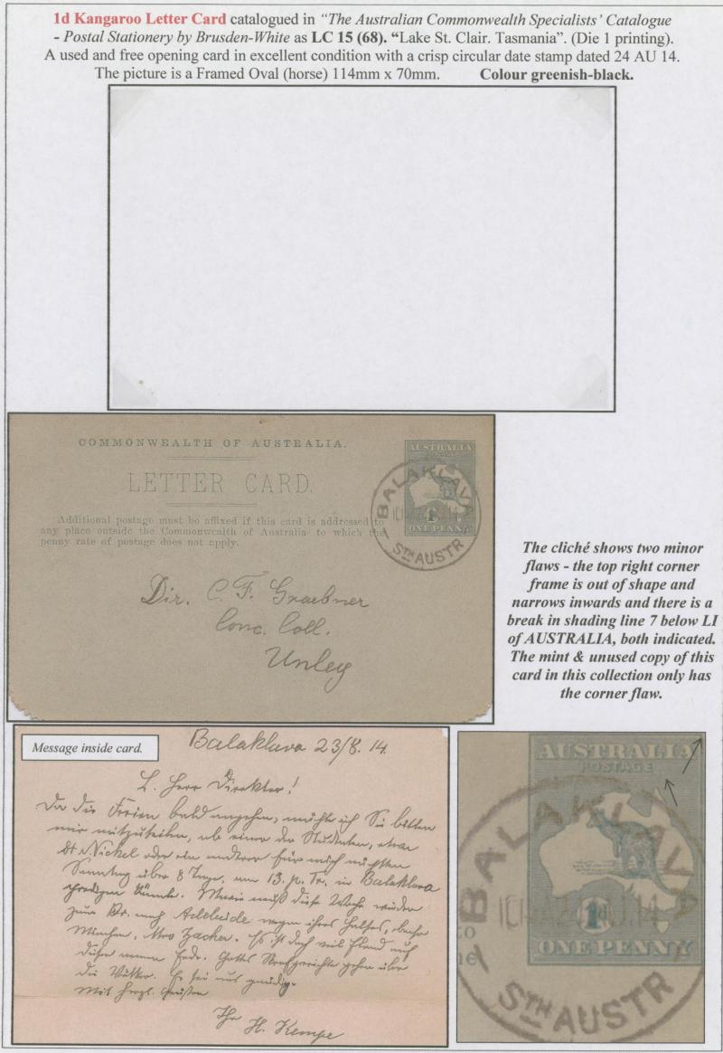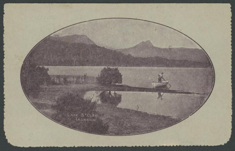 1244 PSE imageLETTER CARDS - SCENIC: Kangaroos 1d Original Die 'LAKE ST CLAIR/TASMANIA' view ACSC LC14(67A) in purple-black, used to "Acland via Oakey Isld" with personal message inside and 'HOCHKIRCH/ MY20/13/VICTORIA' cds cancel, very fine 'MISSENT' straight-line handstamp on the face initialled below but without arrival marking, tiny opening fault at base on the reverse otherwise very fine. (Image1) (Image2) (Image3)