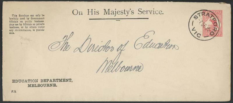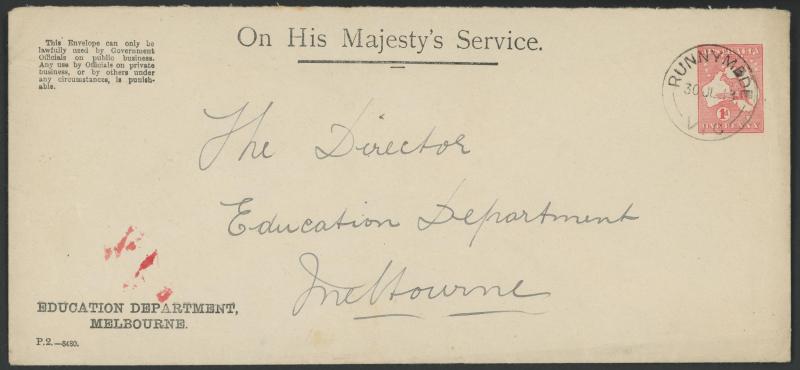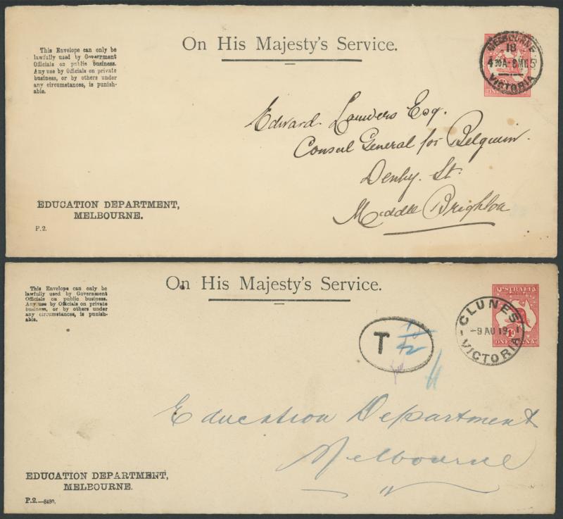 1238 PSE imageENVELOPES - OFFICIAL: 1913-14 Kangaroos 1d red with 'OS'-of-Dots-in-Die Types 1-4 ACSC EO1A-D long-format envelopes for the Education Department, Melbourne with printed 'OHMS' heading & 'Penalty' notice at upper-left, used 1915 to Consul-General for Belgium (Type 1) or returned to the Education Dept (others) with 'CLUNES' 1919 cds (Type 2; taxed "1d" altered to "½"), with 'RUNNYMEDE' 1916 cds (Type 3), or with 'STRATFORD' 1915 cds (Type 4), a few minor blemishes, Cat $1000. A scarce assemby. (4) (Image1) (Image2) (Image3) (Image4) (Image5) (Image6)