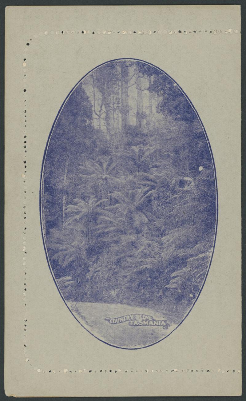 1246 PSE imageLETTER CARDS - SCENIC: Kangaroo 1d Original Die 'COUNTRY SCENE/TASMANIA' ACSC L14(43) in bright violet, a couple of very minor blemishes, unused, Cat $500. A rare view in the Kangaroo Series. (Image1) (Image2) (Image3)