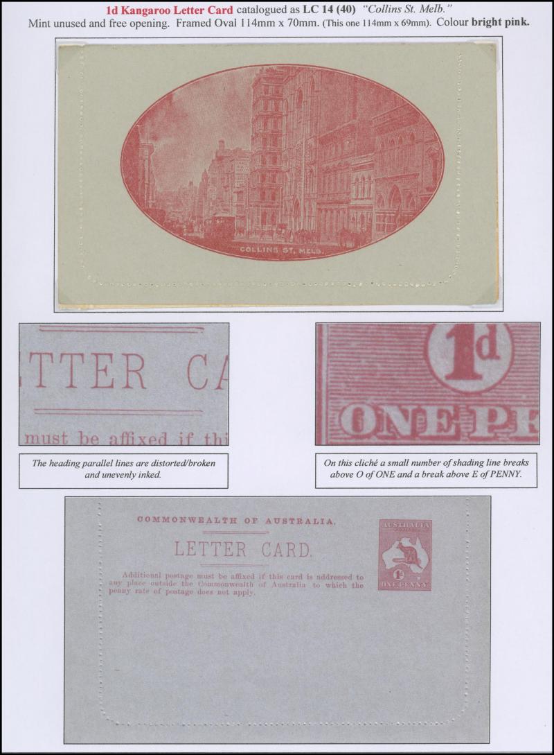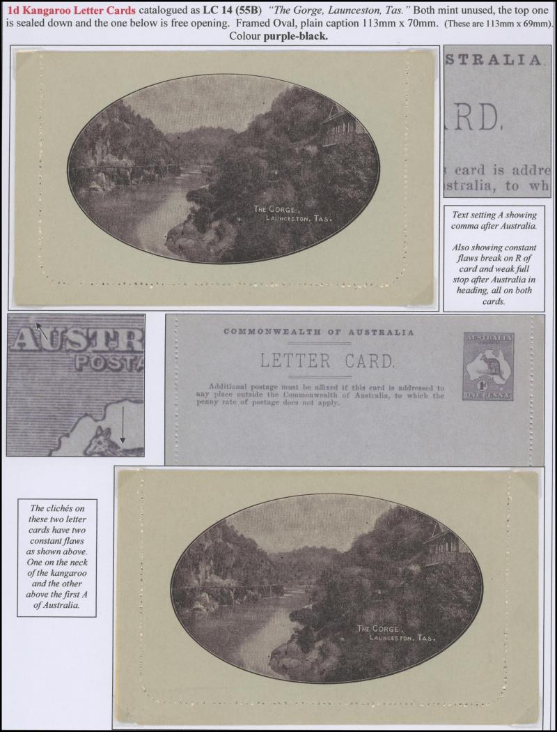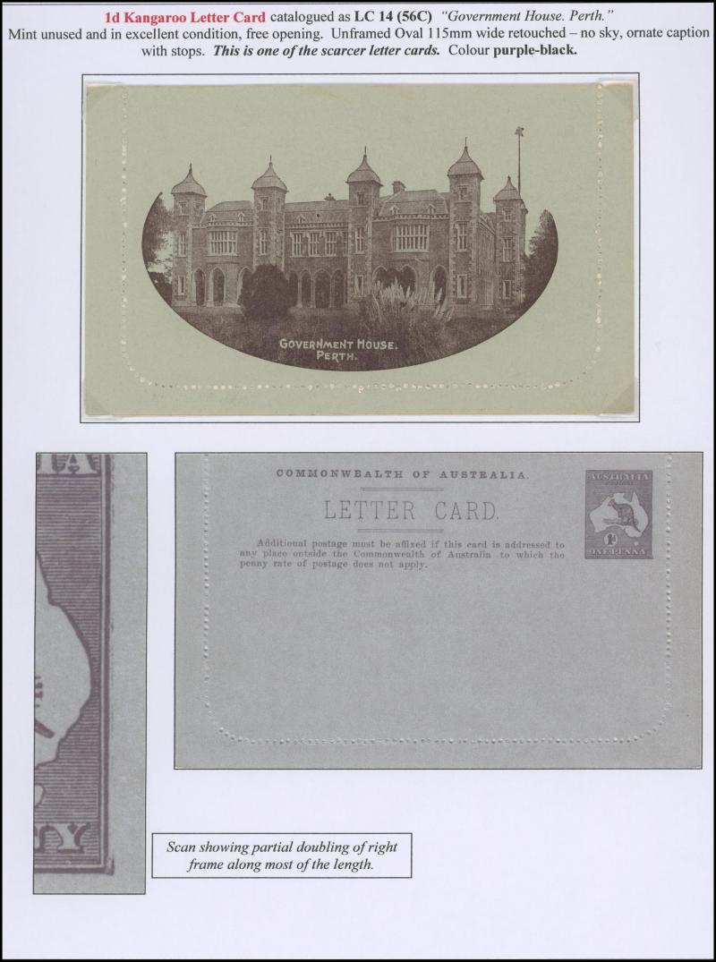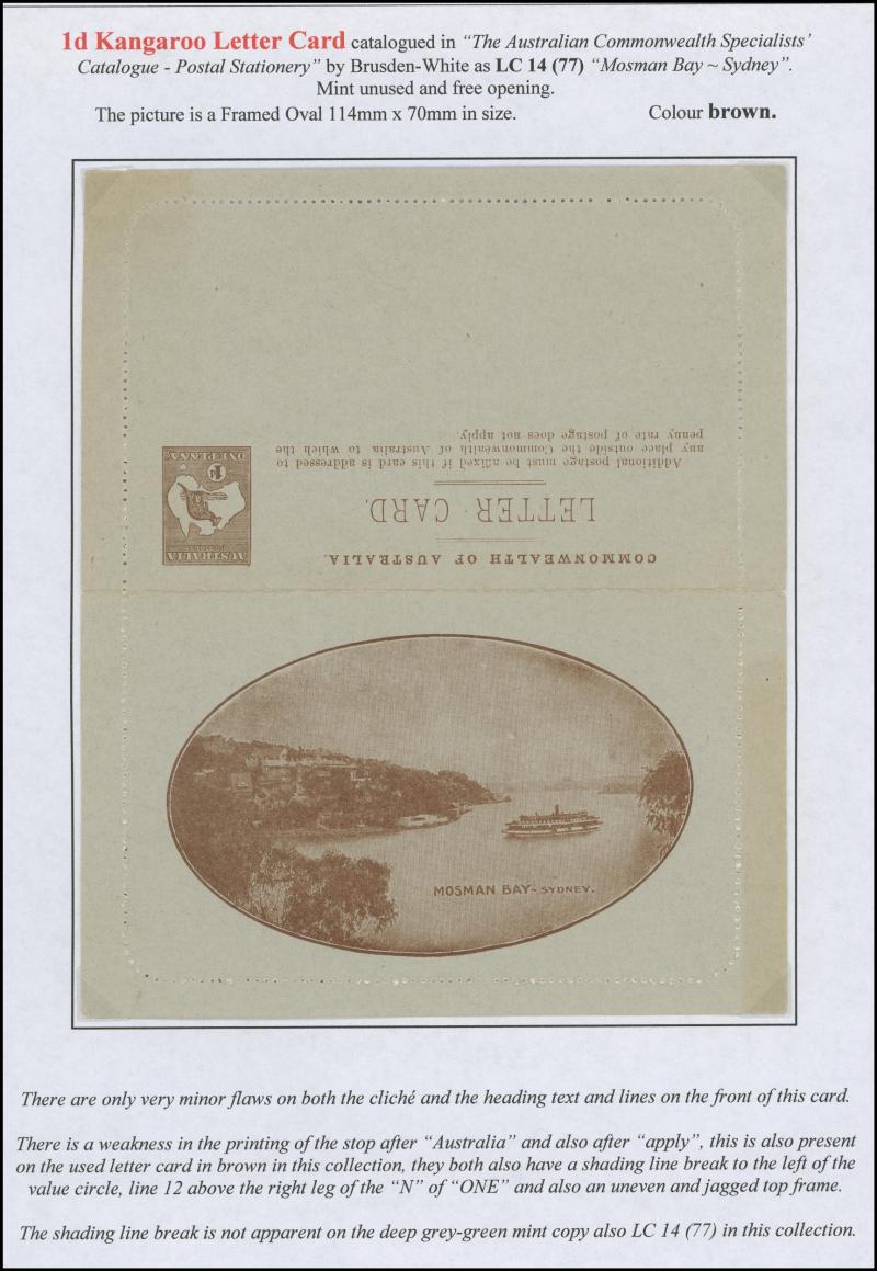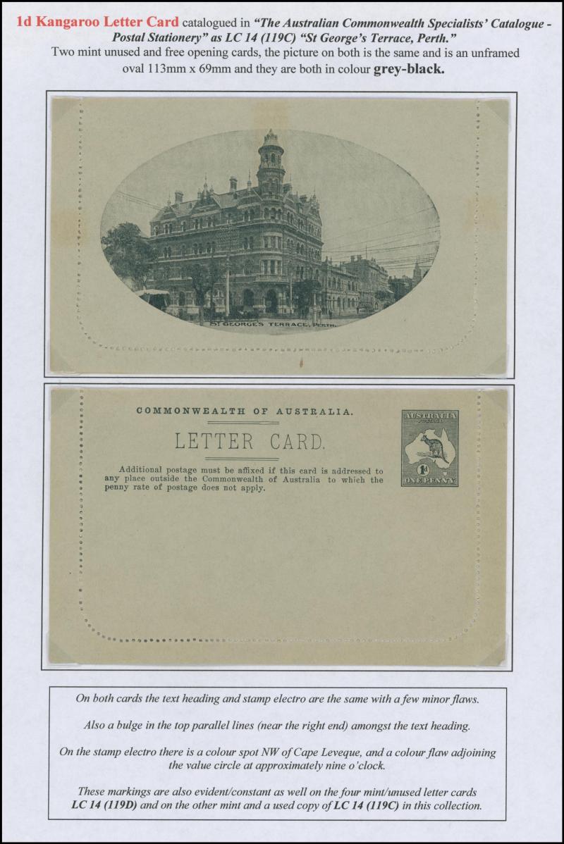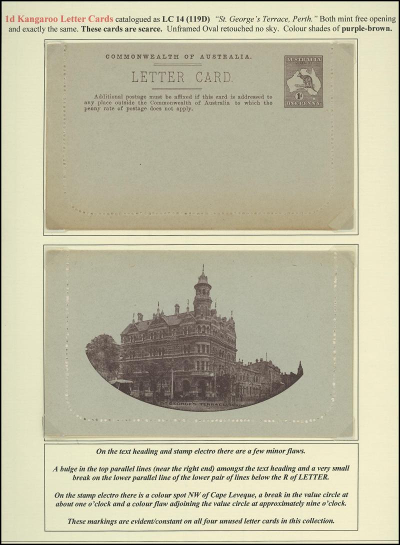 1242 PSE imageLETTER CARDS - SCENIC: Kangaroo 1d Original Die ACSC LC14 extensive collection of unused including 'CATARACT GORGE/LAUNCESTON TAS.' oval x2 & rectangular view, 'CENTRAL RLY STN/BRISBANE' oval with sky & without sky and rectangular, 'THE GORGE/LAUNCESTON TAS.' x5 (two are Setting A), 'GOVERNMENT HOUSE/PERTH' oval & rectangular x2, 'LAKE ST CLAIR/TASMANIA' (boat) x2, 'LORNE/VICTORIA' oval with sky x4 & rectangular x3, 'NATIONAL PARK/N.S.WALES' oval view x4 (two CTO) & rectangular view x2, 'ST GEORGE'S TERRACE, PERTH' oval with sky, oval without sky & rectangular x3 each, 'ZOOLOGICAL GARDENS/PERTH W.A.' oval with sky x3, oval without sky x2 & rectangular x3, etc, excellent range of colours, a few minor blemishes but generally fine to very fine, Cat $14,000+. Ex David Adams, almost all on his pages with copious notes on value indicia & other printing varieties. (89) (Image1) (Image2) (Image3) (Image4) (Image5) (Image6) (Image7) (Image8) (Image9) (Image10) (Image11) (Image12) (Image13) (Image14) (Image15) (Image16) (Image17) (Image18) (Image19) (Image20) (Image21) (Image22) (Image23) (Image24) (Image25) (Image26) (Image27) (Image28) (Image29)