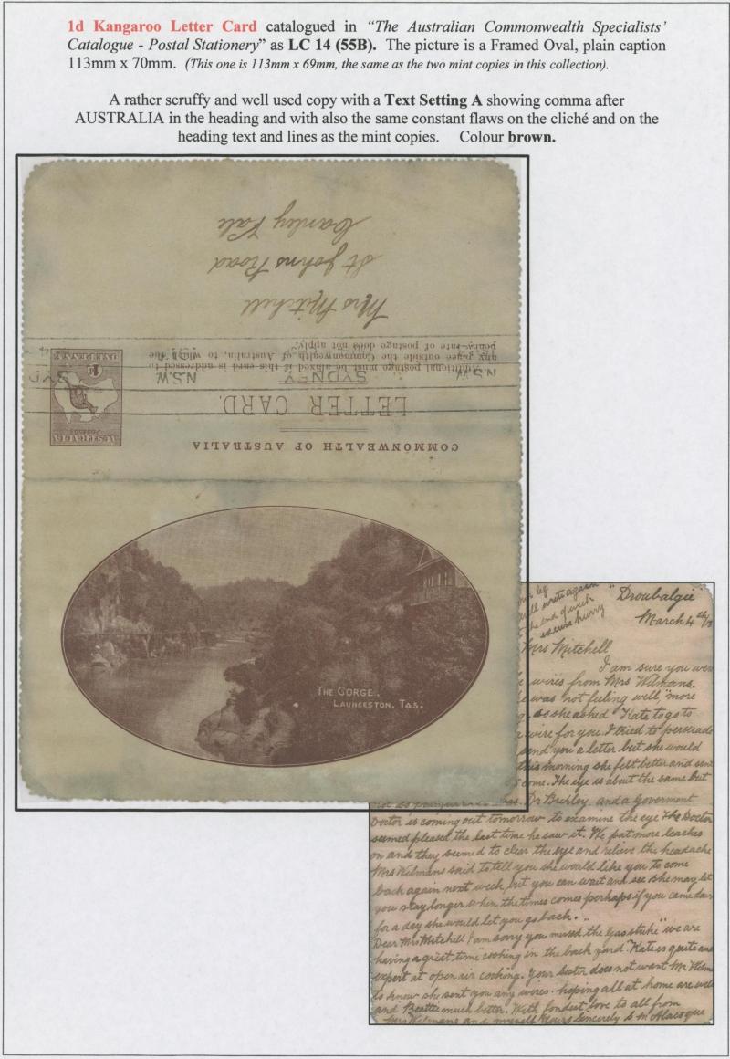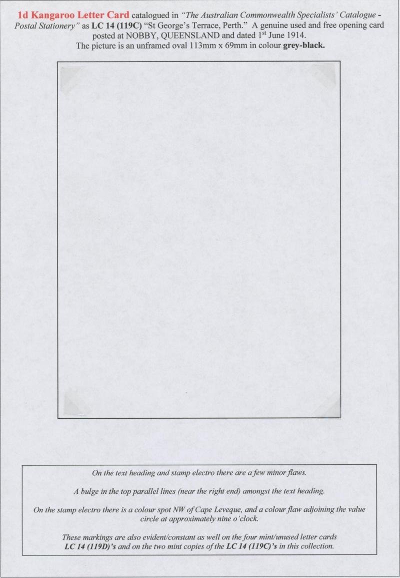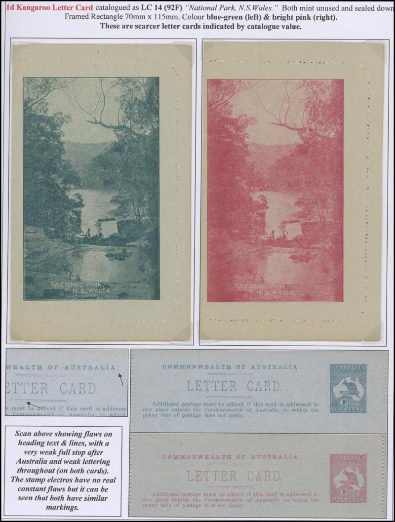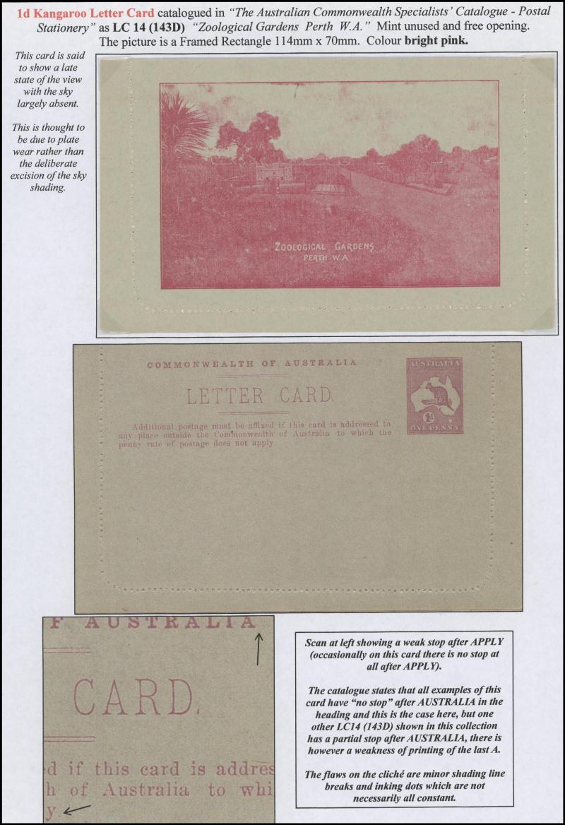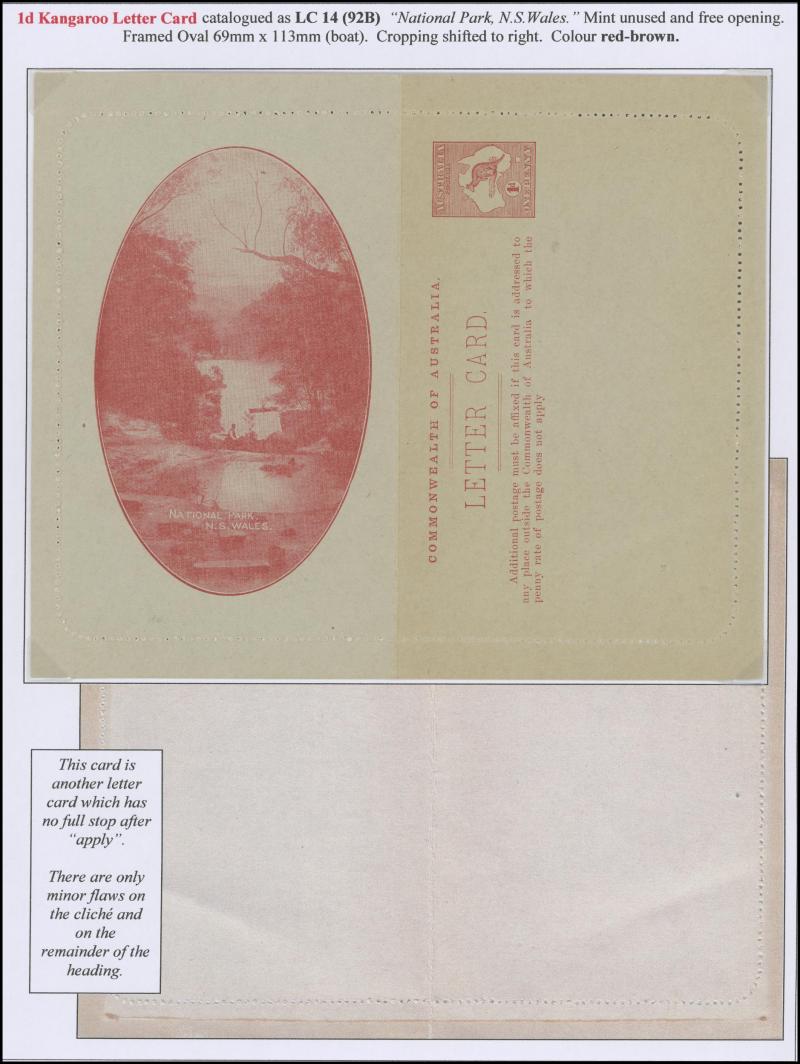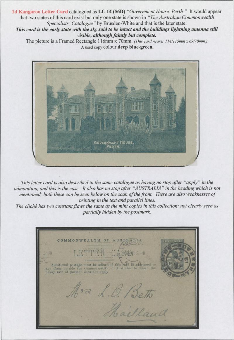 1242 PSE imageLETTER CARDS - SCENIC: Kangaroo 1d Original Die ACSC LC14 extensive collection of unused including 'CATARACT GORGE/LAUNCESTON TAS.' oval x2 & rectangular view, 'CENTRAL RLY STN/BRISBANE' oval with sky & without sky and rectangular, 'THE GORGE/LAUNCESTON TAS.' x5 (two are Setting A), 'GOVERNMENT HOUSE/PERTH' oval & rectangular x2, 'LAKE ST CLAIR/TASMANIA' (boat) x2, 'LORNE/VICTORIA' oval with sky x4 & rectangular x3, 'NATIONAL PARK/N.S.WALES' oval view x4 (two CTO) & rectangular view x2, 'ST GEORGE'S TERRACE, PERTH' oval with sky, oval without sky & rectangular x3 each, 'ZOOLOGICAL GARDENS/PERTH W.A.' oval with sky x3, oval without sky x2 & rectangular x3, etc, excellent range of colours, a few minor blemishes but generally fine to very fine, Cat $14,000+. Ex David Adams, almost all on his pages with copious notes on value indicia & other printing varieties. (89) (Image1) (Image2) (Image3) (Image4) (Image5) (Image6) (Image7) (Image8) (Image9) (Image10) (Image11) (Image12) (Image13) (Image14) (Image15) (Image16) (Image17) (Image18) (Image19) (Image20) (Image21) (Image22) (Image23) (Image24) (Image25) (Image26) (Image27) (Image28) (Image29)