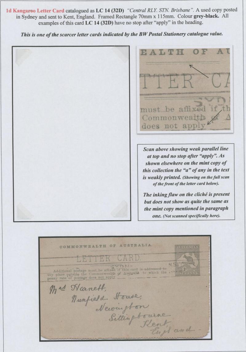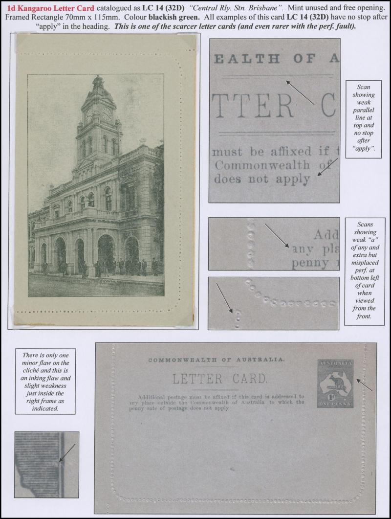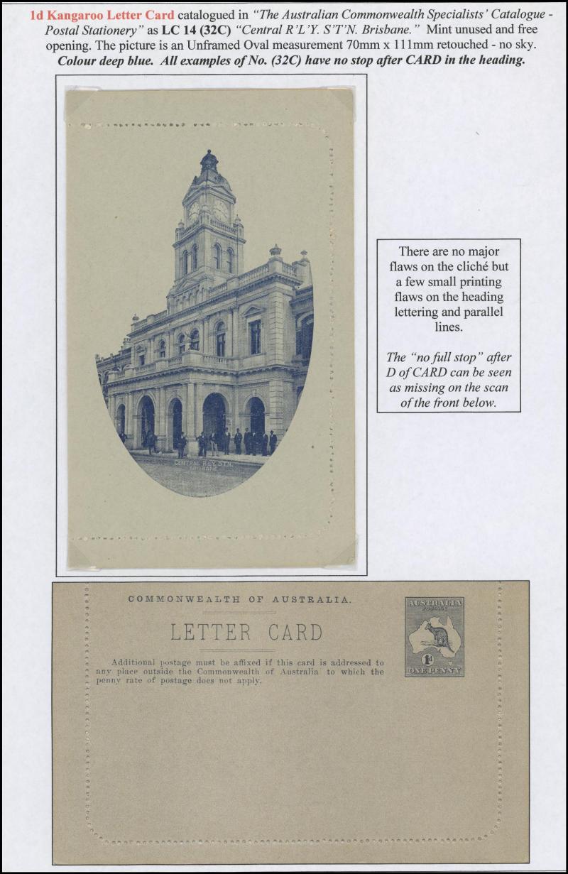 1245 PSE imageLETTER CARDS - SCENIC: Kangaroo 1d Original Die 'CENTRAL RLY STN/BRISBANE' (vertical part-oval) ACSC L14(32C) in grey-brown with Grossly Misplaced Perforations from being Caught in the Perforating Machinery and with some related creasing L14bc, unused, Cat $500. Ex 'Ginger Meggs' (John Sinfield) - sold for $525 (Sale 233 Lot 2068) - and Grace Foundation: sold for $575 (Sale 243 Lot 134). Illustrated in the ACSC, where mistakenly identified as view #143C. (Image1) (Image2)