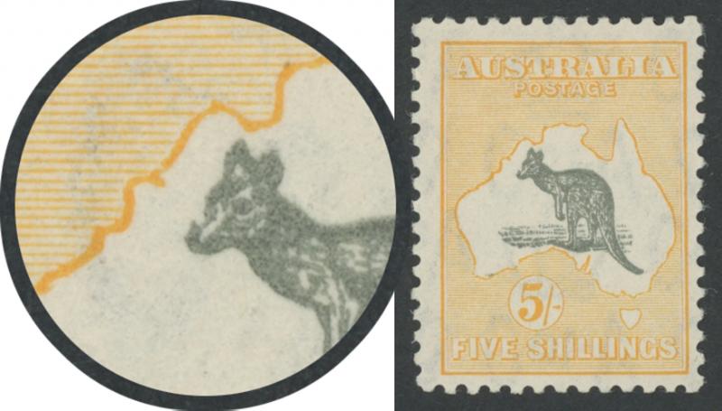 1234 og image5/- grey and yellow-orange SG 135 with Notch in Kangaroo's Snout [Pos L23] ACSC 46(V)i, lightly mounted, Cat $800 (£180+ for normal). (Image1) (Image2)