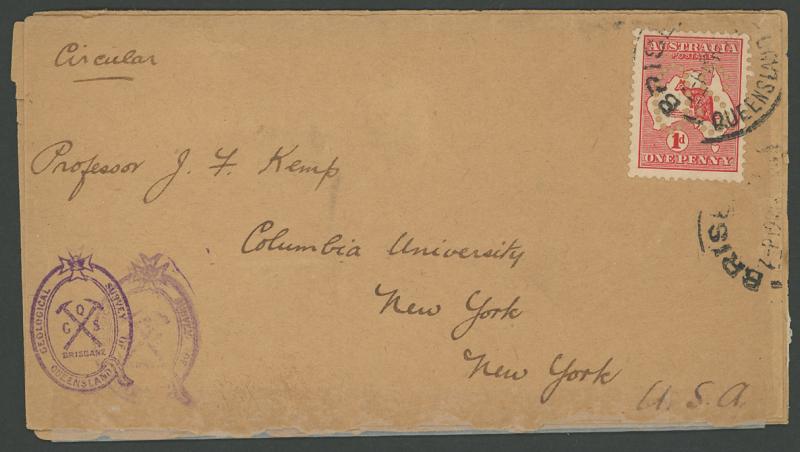 1913 (circa) plain wrapper with 'GEOLOGICAL SURVEY OF/QUEENSLAND' cachet in violet at lower-left & endorsed "Circular" at