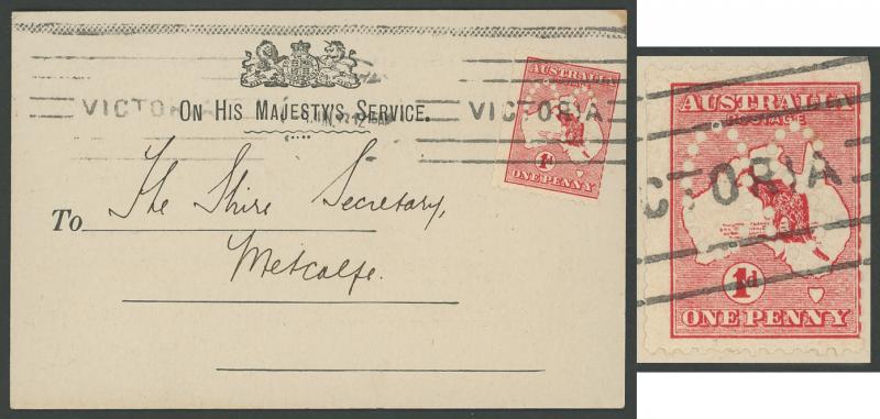 punctured Large 'OS' coil stamp unusually with the characteristic trimmed perfs on both sides tied by Melbourne machine cancel, very minor bend at upper-left. (Image1) (Image2)