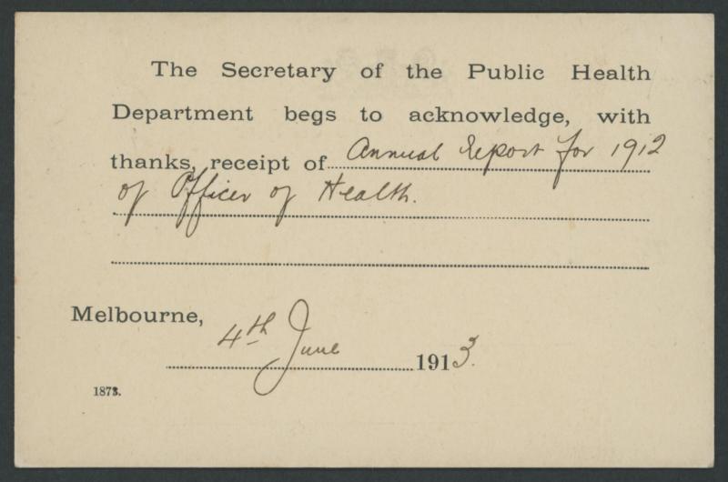 1913 (June 4) usage of Victorian Public Health Department postcard to Shire of Metcalfe with rare franking of 1d red Die I
